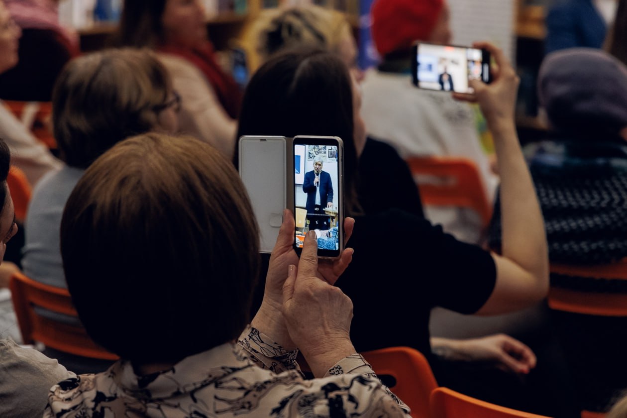 По завершении диктанта Евгения Германовича ждали в БУКе его поклонники и любопытствующие. Библиотека быстро заполнилась: читателям, пришедшим к началу встречи, уже не хватило сидячих мест. Приветственные слова произнесли исполнительный директор фонда «Тотальный диктант», организатор акции во Владивостоке Вячеслав Беляков, директор городской библиотечной сети Игорь Филиппов.