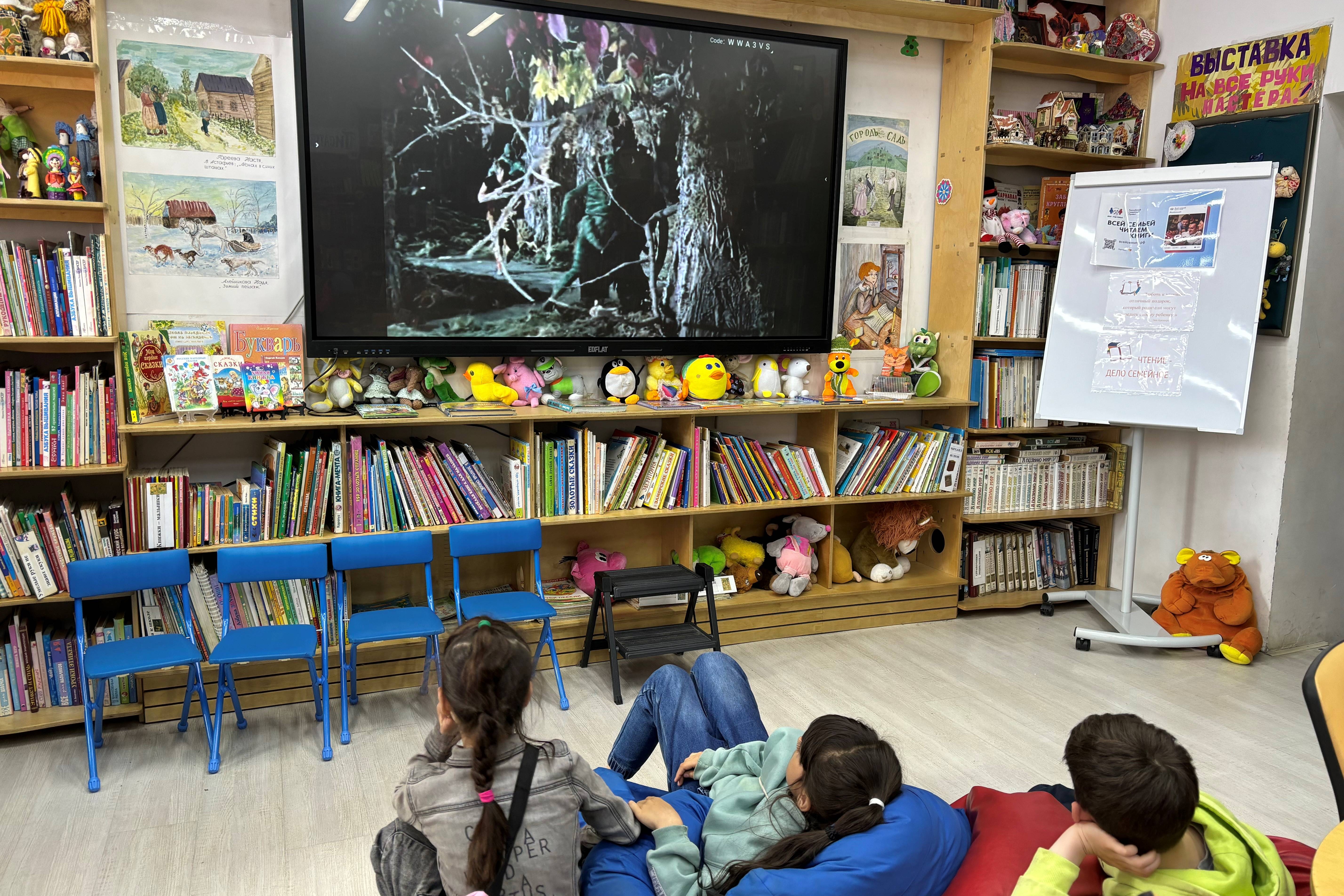 Удобно устроившись, кто на стульях, кто на мягких пуфах, ребятишки смотрят интересные мультфильмы на большой интерактивной панели, потом обсуждают увиденное. Послушав и увидев презентацию про город Юрьевец, дети стали регулярно смотреть сказки известного режиссера Александра Роу, а потом искать эти сказки на полках библиотеки, чтобы потом их прочитать и сравнить с фильмом.