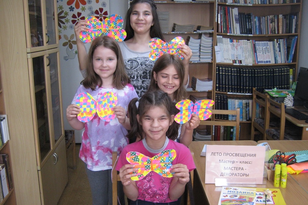 Июнь останется в памяти многих ребят, как месяц плодотворного творчества в библиотеке №15. Весь месяц в библиотеке работала мастерская «Юный декоратор». Дети учились правилам художественного оформления выставок, гармоничной расстановке книг, дизайнерскому подходу к украшениям и конечно изучали цветовую гамму лесных полянок, растений и порхающих бабочек. Все получилось ярко, сочно. И ромашки июньские расцвели, где надо, и полянка радует глаз, а уж бабочки как научились красиво порхать, просто загляденье.