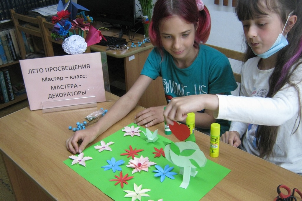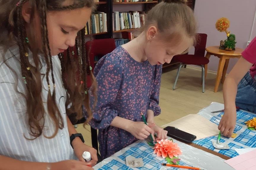С начала июня для юных читателей библиотеки №13 работала творческая мастерская «Цветы из бумаги». Цель мастерской – научить ребят новым и необычным приемам и методам работы с бумагой. Поэтому каждое занятие направлено на освоение одного из направлений бумагопластики. Одно из занятий было посвящено созданию объемных цветов в технике конструирования и объемной аппликации.