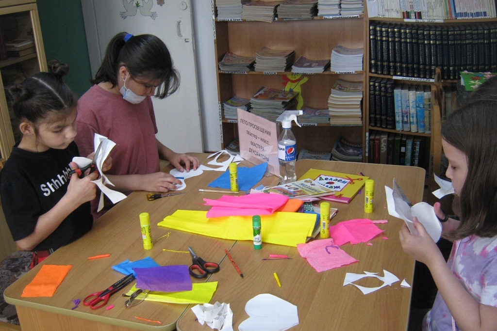 В библиотеке им. И.У. Басаргина весь июнь ребята на творческой мастерской «Смайлики» знакомились с историей древнего восточного искусства – оригами, научились пользоваться разными техниками этого искусства. С интересом вырезали и приклеивали детали из бумаги для аппликации «Флаг России». Научились рисовать карандашами животных разными техниками. На протяжении всех занятий дети с удовольствием отгадывали веселые загадки, решали кроссворды и ребусы.