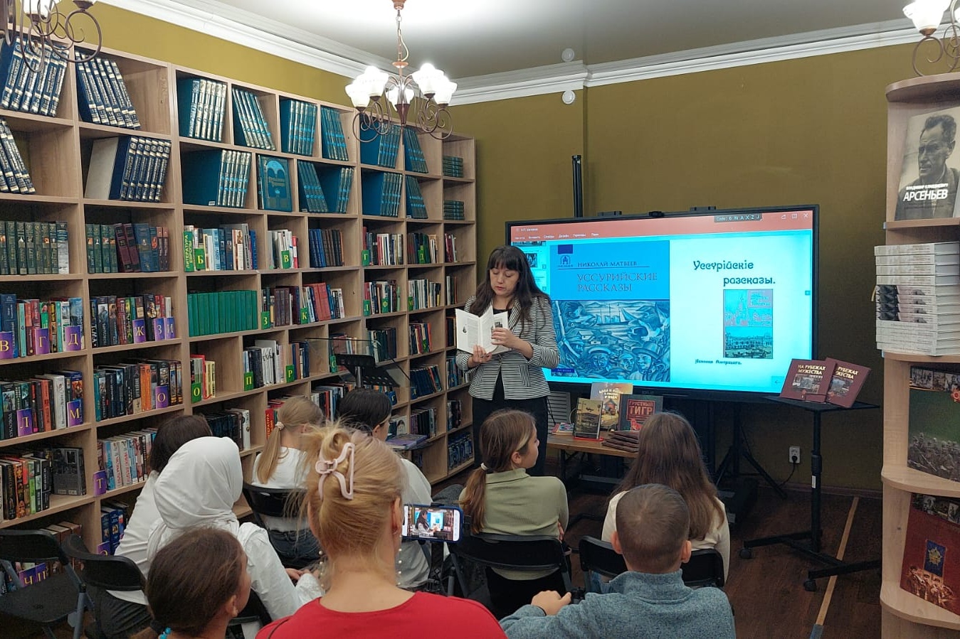 Сборник прозаических произведений «Уссурийские рассказы» – это правдивая картина жизни, быта и нравов прошлого Приморья конца XIX — начала XX веков. Юные журналисты услышали несколько автобиографичных рассказов о детстве мальчика, в 9-летнем возрасте Николай убегает из дома от отчима- изверга и несколько лет скитается по Приамурью и Уссурийскому краю. Благодаря начальнику пограничной заставы на оз. Ханка Матвеев обретает приют и семью, а чуть позже отправляется во Владивосток учиться и получать профессию. Свои короткие рассказы Николай Петрович пишет под псевдонимом Амурский. Герои его рассказов простые труженики, моряки, обманутые девушки, корейцы, китайцы, японцы, приехавшие на заработки, с надеждой на лучшую жизнь, а также ссыльные каторжники и просто обездоленные. Дети-журналисты взяли интервью у ведущего и задали ряд вопросов по краеведческой литературе для детей в рамках Губернаторской издательской программы.