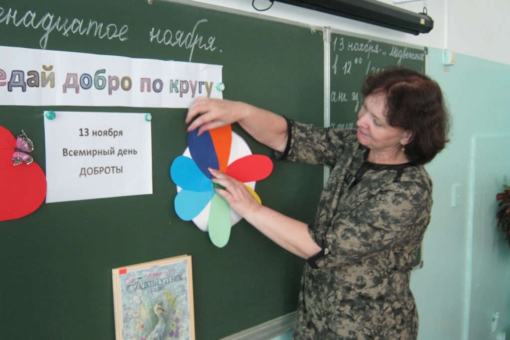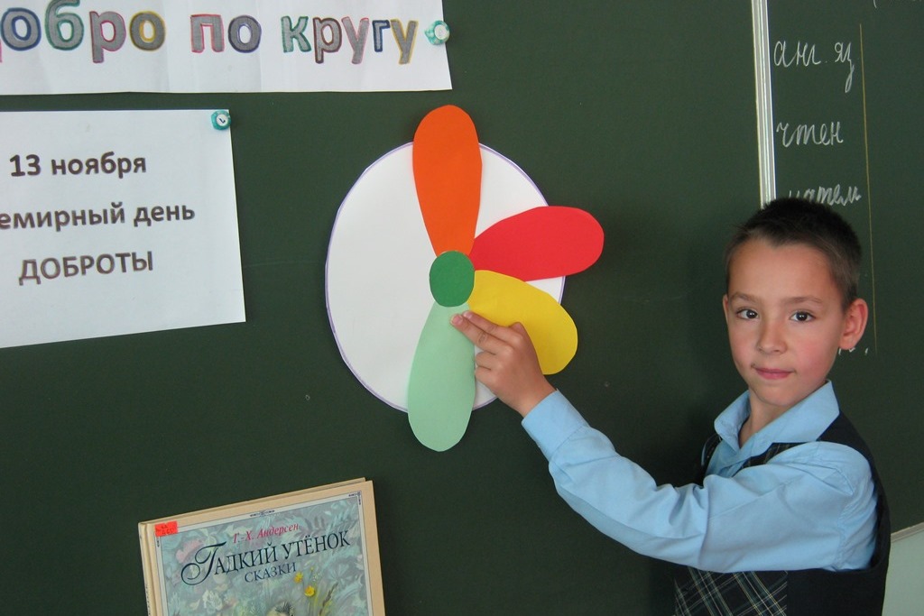 В 1997 году японцы придумали праздник спонтанной доброты. День этот выпал на 13 ноября, с тех пор эта дата стала общемировым праздником. Символом этой даты стало большое человеческое сердце, открытое для всего человечества. С точки зрения философии у человека есть две жизни. Одна, та в которой мы живем, приспосабливаясь к окружающему миру. И вторая, в которую мы впадаем, когда творим, когда любим, когда делаем добро. Нельзя спросить человека, почему он сделал добро, а нехороший поступок надо объяснять и оправдывать. Внимательно прослушав беседу, ребята и сами подключились к разговору, очень важному в их жизни. Дети делились своими наблюдениями о взаимоотношениях и среди одноклассников, друзей по играм и даже семейных. Кому-то помогли найти потерявшийся телефон, кто-то поделился вкусняшкой на перемене, дома убрали не только свою комнату, и все дети сказали, что им была очень приятна похвала и простое слово «спасибо».
