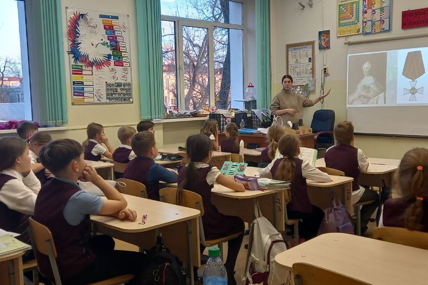 Вспоминали также исторические события России, связанные с войнами и всех защитников Отечества от дружины Александра Невского до регулярных частей Красной Армии, увидели, как эти события отражены на полотнах выдающихся русских художников: В.М. Васнецов «Богатыри на заставе», П.Д. Корин «Александр Невский», М.Б. Греков «Полтавский бой», В.И. Суриков «Переход Суворова через Альпы».