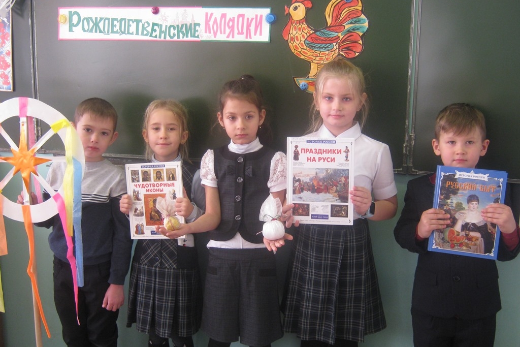 Детям рассказали, что название этого праздника происходит от словосочетания «святые вечера». Их отмечают в период от Рождества до Крещения, т. е. с 8 по 17 января. По традиции в эти дни с подарками и песнями посещают дома родных, близких, знакомых. И все, кто бы ни появился на пороге дома, тоже получают от хозяев подарки.