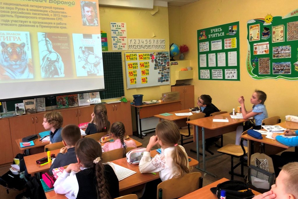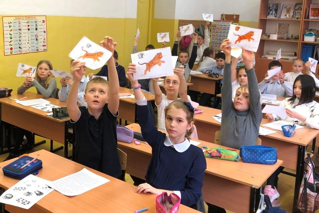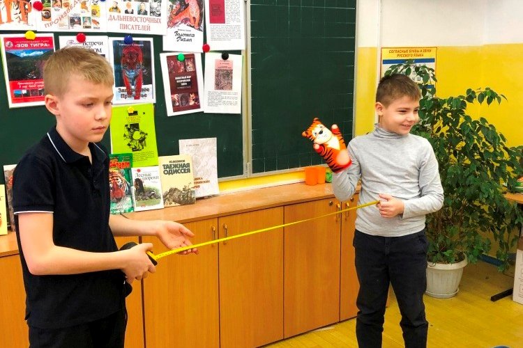 В преддверии дня рождения самобытного Приморского прозаика Ивана Ульяновича Басаргина учащиеся 3 «Г» и 3 «В» классов школы № 80 г. совершили путешествие по страницам книг дальневосточных писателей, в котором получили краткие сведения об одном из совершеннейших хищников на земле – амурском тигре, его образе жизни и отношении к нему человека. На индивидуальных карточках указали размеры, вес, некоторые морфологические особенности владыки уссурийских дебрей; узнали о его рационе питания, особенностях поведения. Юные следопыты нашли на карточках-заданиях под каким номером находятся следы тигра и даже ответили на вопрос: «По чьим следам может чаще всего пойти тигр?» А выполнять задания и физкультминутку помогал маленький Тигрёша.