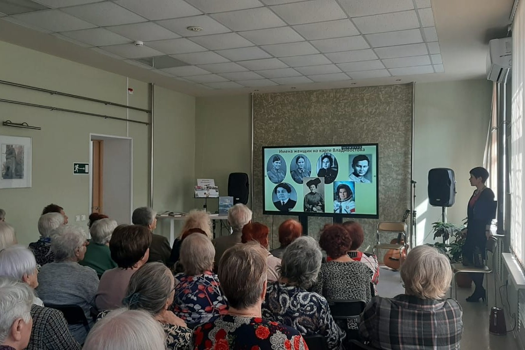 Краеведческий час «Имена женщин-героев на карте Владивостока», посвященный Году защитника Отечества и Международному женскому дню для участников общественной организации «Союз пенсионеров России» состоялся в библиотеке им. Н.Н. Муравьева-Амурского.