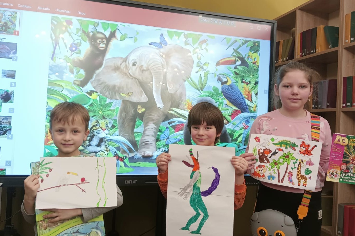 Сотрудники библиотеки № 4 (ул. Светланская, 205) предложили юным читателям отправиться в этот день в виртуальное путешествие в мир джунглей и тропических лесов. Помощниками в путешествии стали яркие познавательные книги, журналы и энциклопедии о животных, необычных птицах, пресмыкающихся и редких деревьях, которые населяют джунгли. Удивили ребят броненосцы, симпатичные капибары, огромная популяция чудесных говорящих попугаев (около 320 видов), неугомонные калибри, ягуар-охотник, но больше всего поразили необычные деревья. Черимойя, плоды которого по вкусу напоминают мороженное, а ещё хлебное дерево, эвкалипт радужный, огуречное дерево или дендросициос и одно из самых красивых деревьев в мире-Королевский делоникс. Эти удивительные деревья растут в жарком и влажном тропическом климате. Дети попробовали изобразить богатый разнообразный мир джунглей на бумаге. У них получились замечательные творческие истории, о которых юные почемучки тут же поведали всем присутствующим.