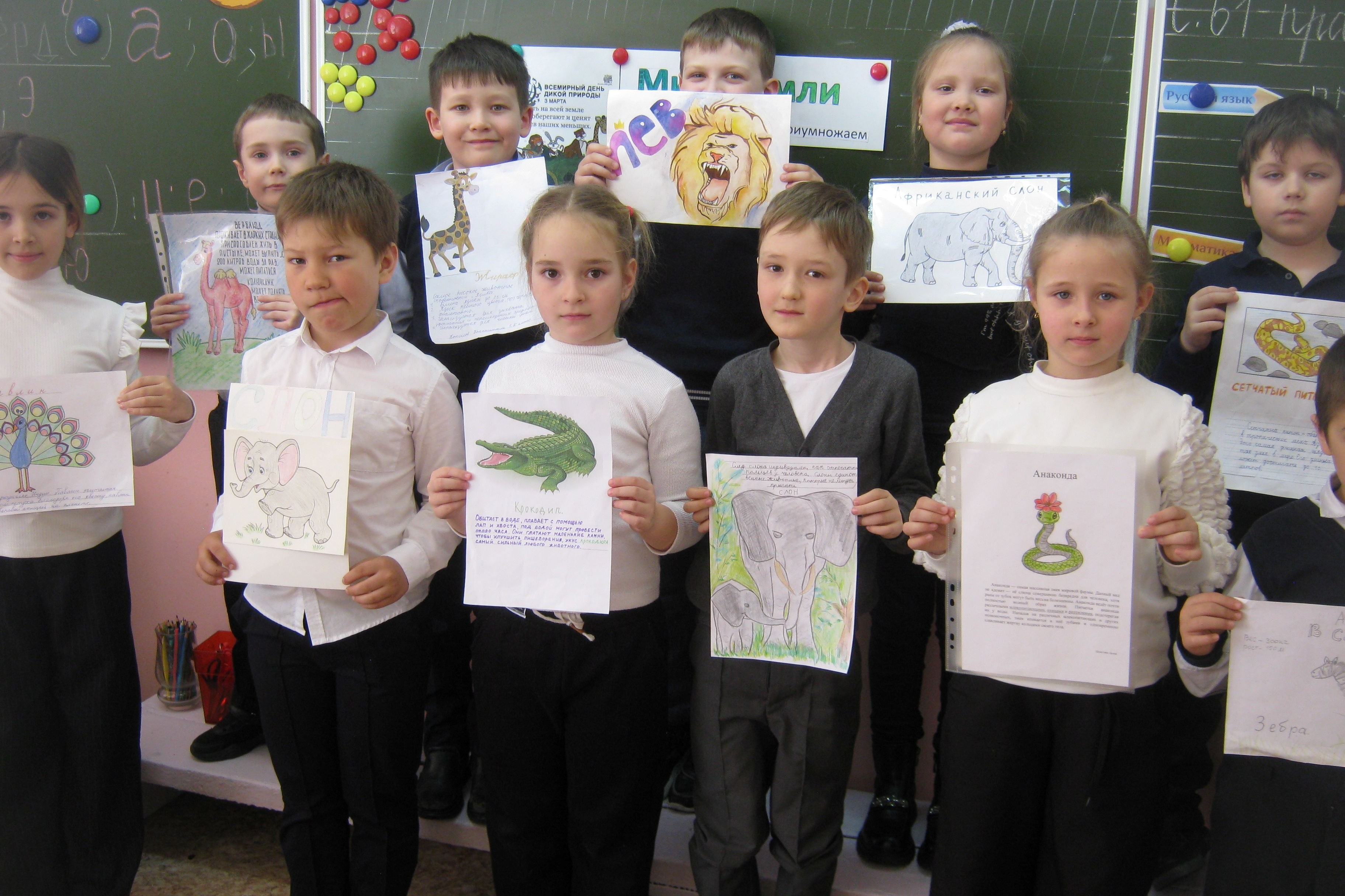 Библиотека № 15 провела эко час «Мир Земли – охраняем, исследуем, приумножаем» для учащихся 1 «А» класса ЦО «Вектор», школа № 54. К эко уроку первоклассники подготовили небольшие доклады и с помощью родителей нарисовали диких животных из «Красной книги» мира. Все животные живут в дикой природе и все они нуждаются в защите человека от полного вымирания. Рассказывает ученик Емельянов Денис: — «У многих животных есть когти и клыки с помощью которых они охотятся и защищаются. Но есть и те, у кого нет ни клыков, ни когтей. Это пресмыкающиеся, я нарисовал питона, он сильный, красивый и беззащитный, он на грани вымирания. Люди боятся их и уничтожают, но питон не имеет ядовитых зубов, потому не опасен для человека. Пусть живут все дикие животные, они тоже, как и люди имеют право на жизнь». Дети прослушали обзор книг. Гильзенбах Х. «Деревья» — о жизни деревьев от Европы до Африки. Кристина Хенкель «Большая книга о природе» — о жизни дневных и ночных животных, Энциклопедия «Герои животного мира» рассказывает о рекордах, удивительных историях и подвигах животных.