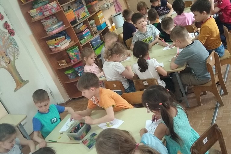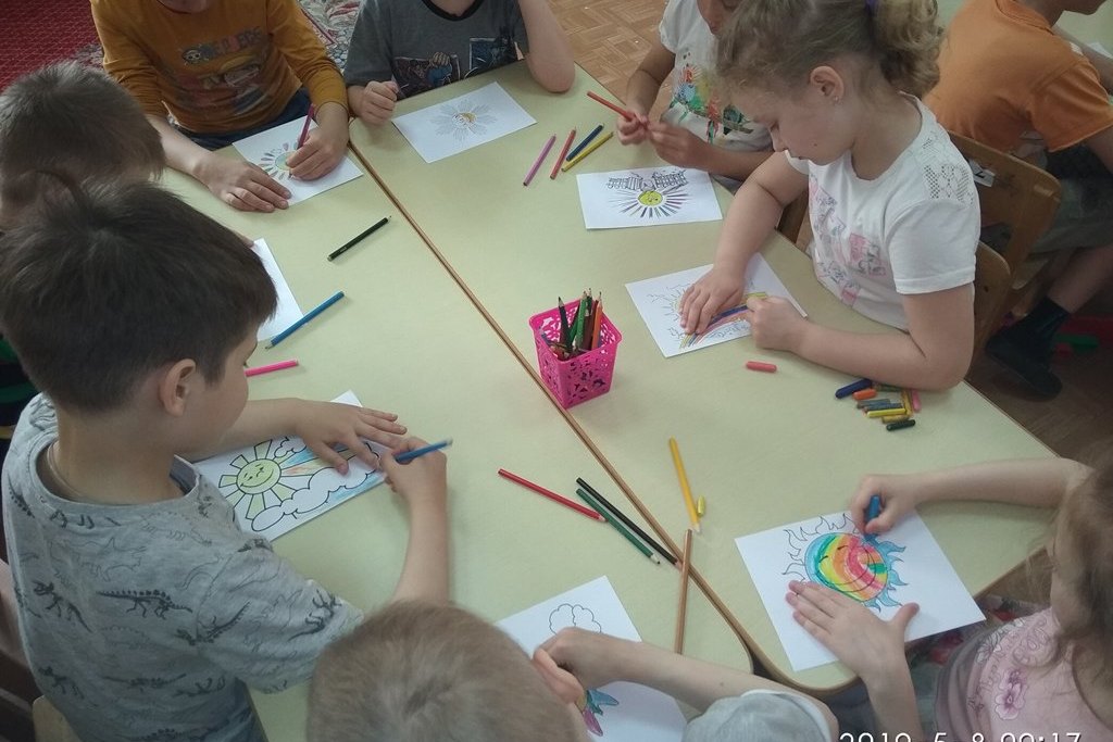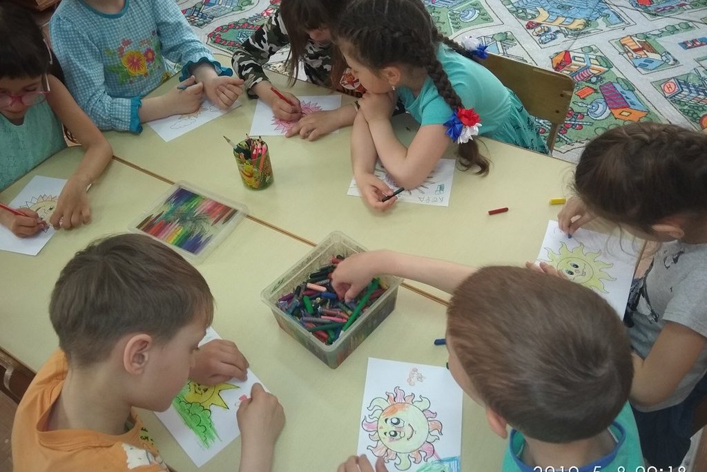 В «творческом» блоке каждому ребёнку предстояло раскрасить заготовку изображения солнышка, а вечером подарить картинку маме и папе, сопроводив подарок тёплыми словами.