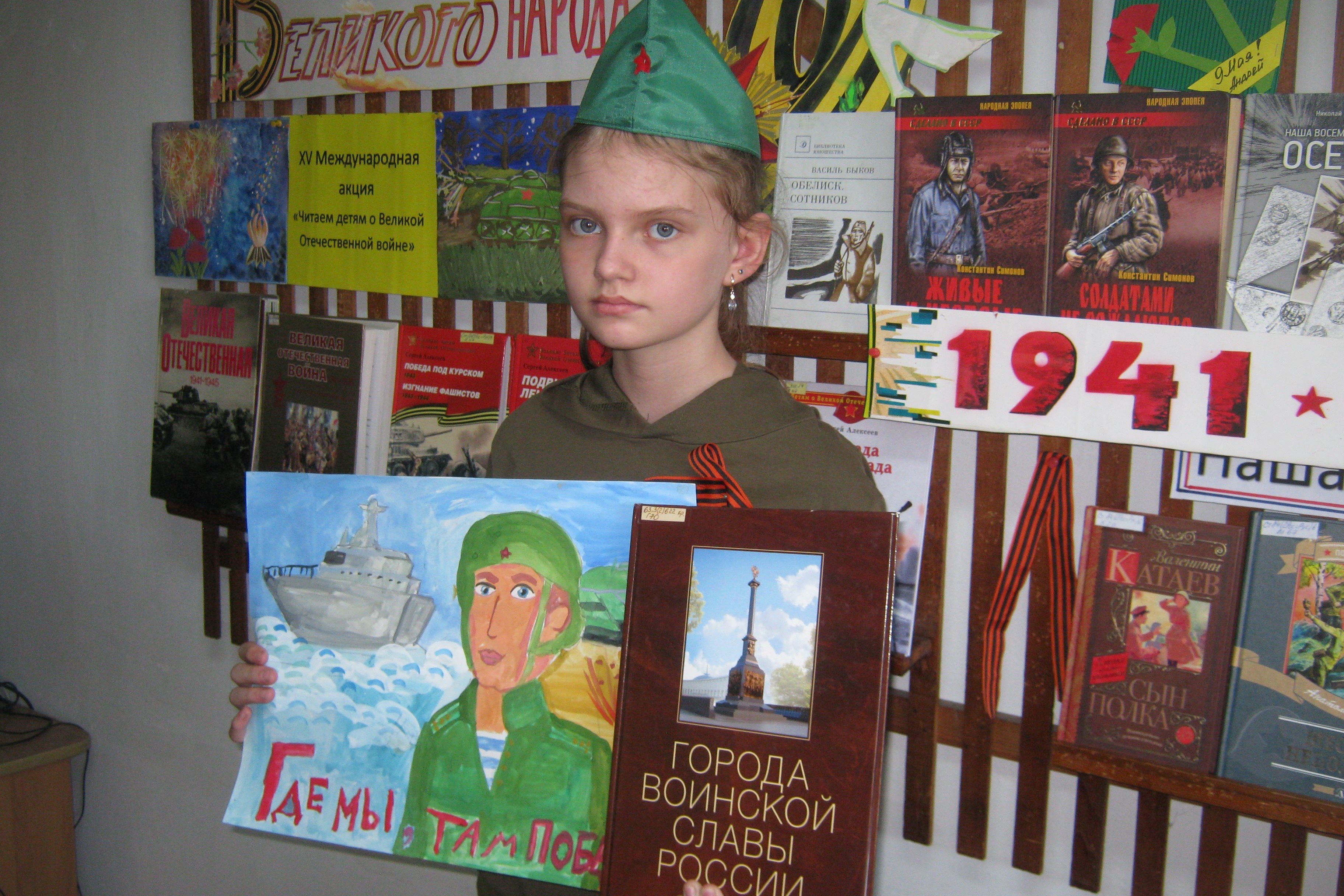 Студия «Русские узоры» работает третий год, и они частые гости библиотеки на Тихой. В этот раз ребята пришли на XV Международную акцию «Читаем детям о Великой Отечественной войне». Студийцы разного возраста, но они дружная команда, дети заранее выбрали книги о войне для домашнего прочтения, чтобы нарисовать понравившегося героя. Для беседы были выбраны книги Б. Васильев «А зори здесь тихие», В. Катаев «Сын полка», сборник «Юные герои». Настя Коноваленко нарисовала смелого десантника морской пехоты Тихоокеанского флота. После семейного чтения книги «Города воинской славы России» девочка нарисовала воина морской пехоты, потому что именно о них читала ее семья и восхищалась мужеством моряков – десантников. А все вместе ребята читали книгу В. Катаева «Сын полка».