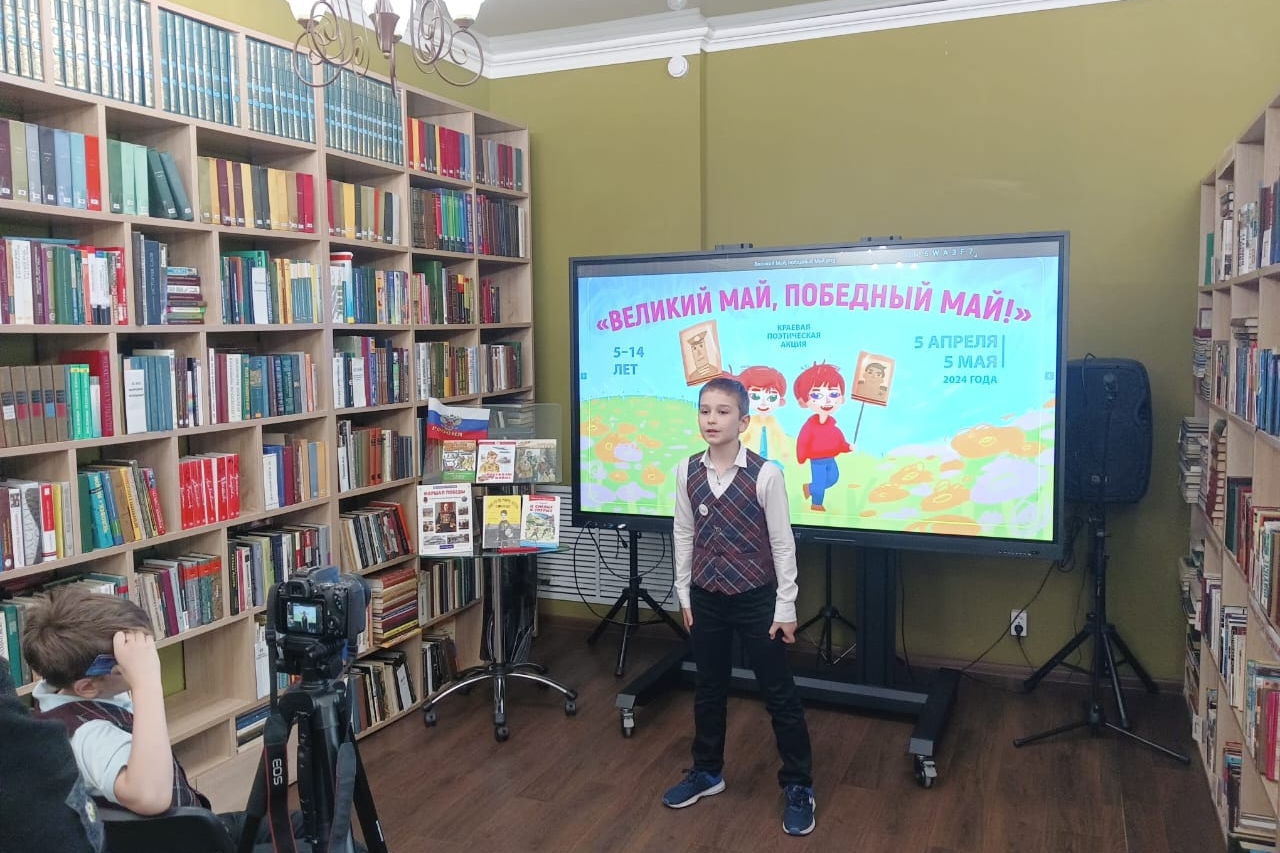 В предпраздничные дни мая сотрудники библиотеки №4 вместе с юными читателями, учащимися 3-5 классов МБОУ «СОШ №22» приняли участие в краевой поэтической акции «Великий Май, победный Май». Организатором акции выступила Приморская краевая детская библиотека Ребята с удовольствием выучили наизусть предложенные стихи и торжественно-трогательно продекламировали их на камеру. Прозвучали стихи: Твардовского «Рассказ танкиста», Л. Преображенской «Вовкина бабушка», В. Турова «Дедушкин портрет», В. Берестова «Мир», Ю. Коринец «Неизвестный солдат».