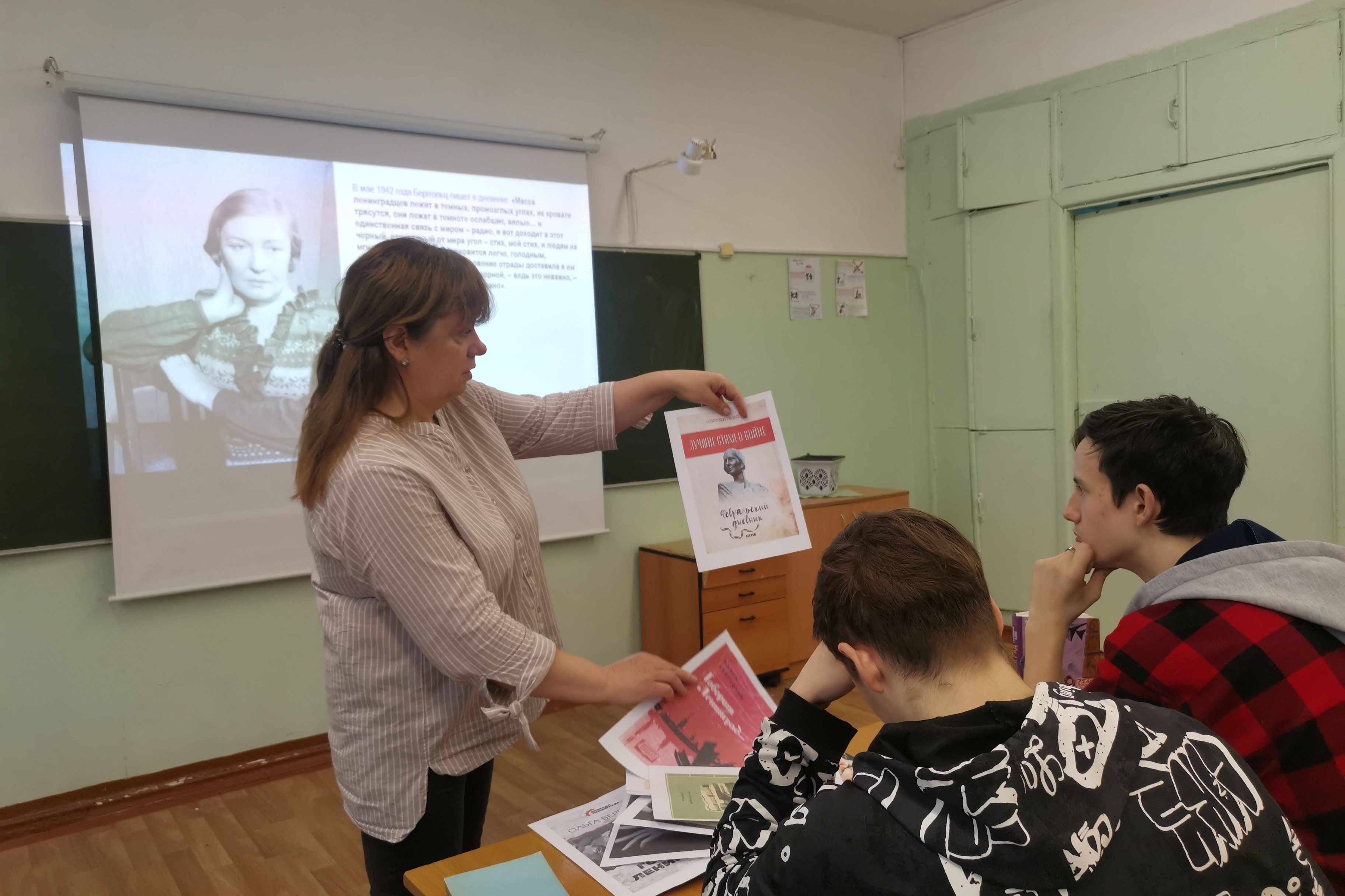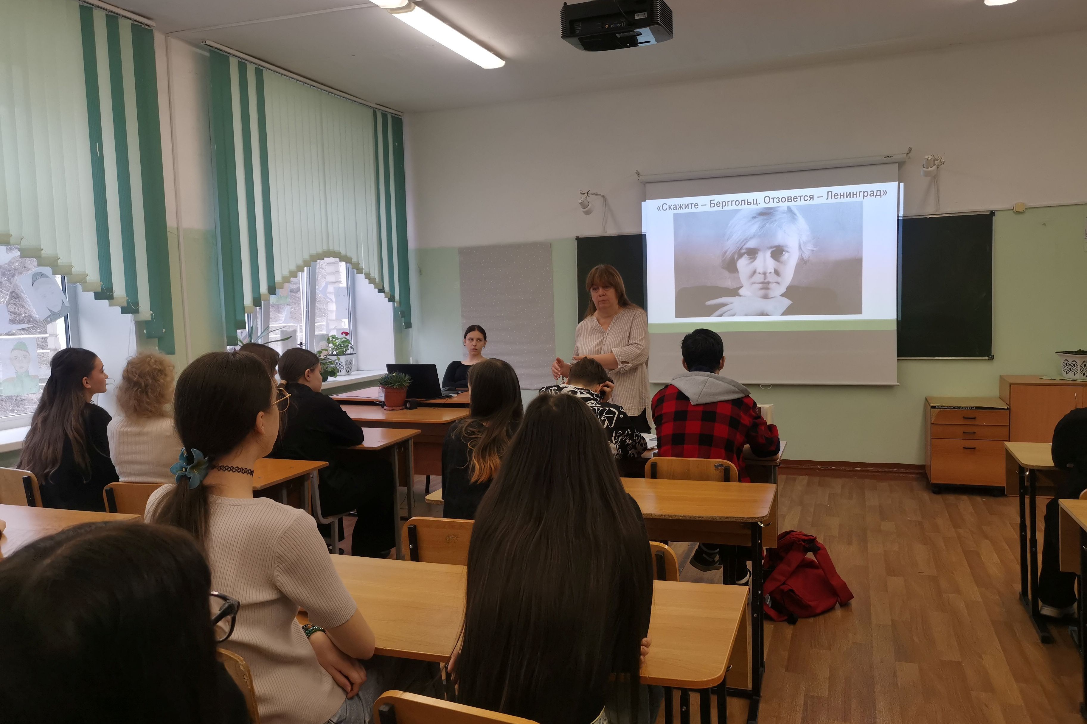 Час мужества организовала библиотека № 16 для учащихся 7 «А», 8 «А» и 9 «А» классов СОШ № 43. Посвящен он был 115-летию со дня рождения русской поэтессы, военного журналиста Ольги Федоровны Берггольц и Году защитника Отечества.
