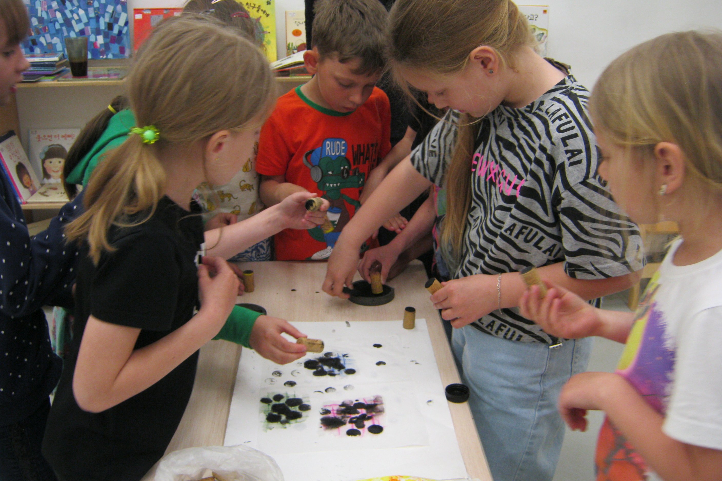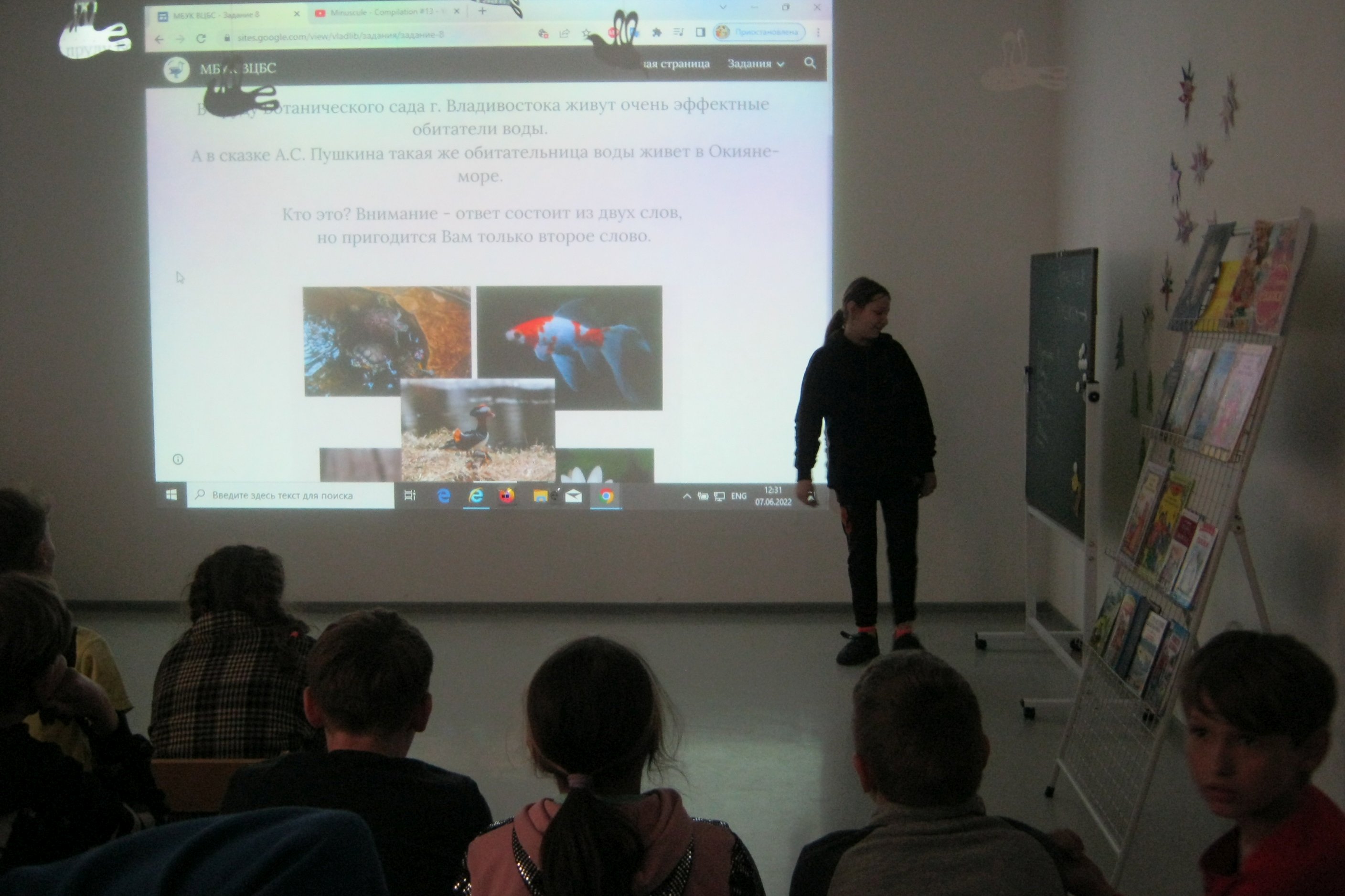 Начало летних каникул сразу чувствуется по наплыву детей в библиотеки. Школьники со списками летнего чтения начали приходить на детский абонемент еще с конца мая, но пока очередей за книгами не выстраивается, как это бывает в июле — августе. Зато июнь – это время тесного сотрудничества библиотеки №8 и детских пришкольных лагерей. Каждый день в библиотеку приходят отряды учеников из школы №35 или центра развития творчества детства и юношества или из детского развивающего центра «Цветные ладошки». Одна группа пришла на нескучное занятие, приуроченное к дню рождения Александра Пушкина, на этом занятии очень кстати пришелся квест «Пушкинград», сохранившийся в архиве сайта городской сети библиотек. Тема сказок Пушкина в этот же день продолжилась на творческой мастерской, дети клеили нарядную рыбку из цветной бумаги. Для других двух групп школьников был подготовлен обзор книг со страшными и мистическими историями для детей, причем, самыми заинтересованными в такой литературе оказались молодые сопровождающие отряда. И, наконец, у «Цветных ладошек» состоялось знакомство с книгами японских писателей и элементами традиционной и современной японской и китайской культуры. Каллиграфией дети, конечно, не занимались, но сравнили китайскую твердую тушь и обычную русскую в бутыльке и попробовали оставить отпечаток тушью на рисовой бумаге.