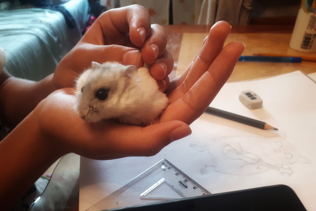 А ещё у меня есть любимый питомец. Это хомяк по имени Сахарок. И мне кажется, что если бы он захотел играть на каком-то музыкальном инструменте, то выбрал бы укулеле или гитару».