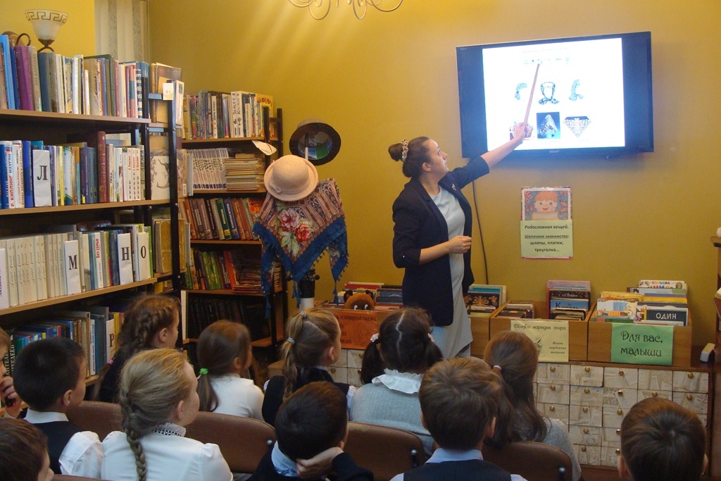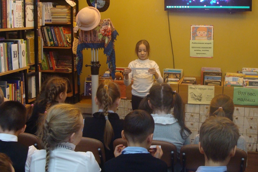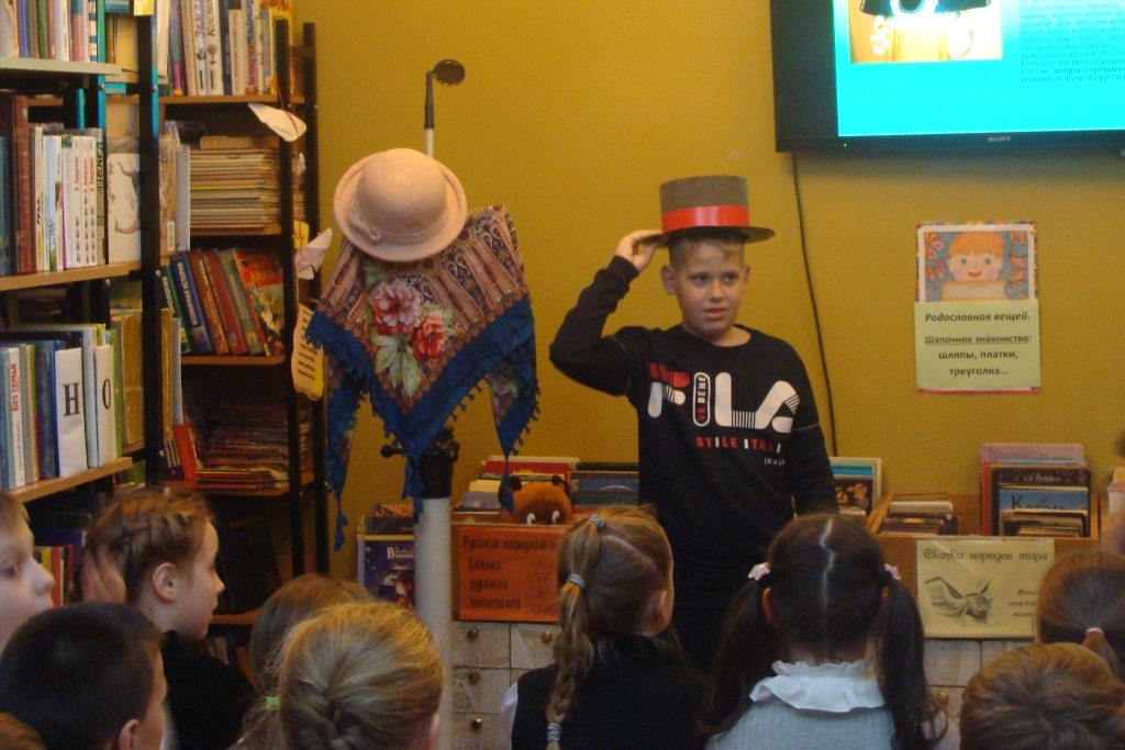 Была рассказана также история появления цилиндра и конечно все ребята вспомнили великого русского поэта А.С. Пушкина, чей образ не обходится без этого элегантного элемента одежды. Известно, что «шапокляк» — это складной цилиндр. А что же носили на Руси в столице и в слободе, в деревне? О боярских шапках и простом мужицком треухе, о картузе рассказали сотрудники библиотеки ребятам.