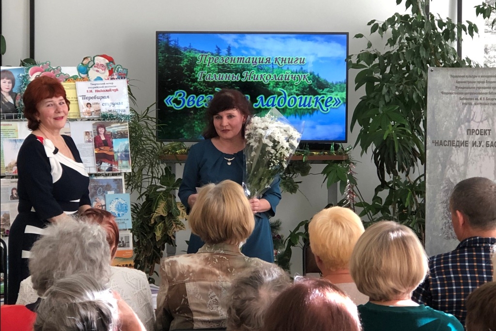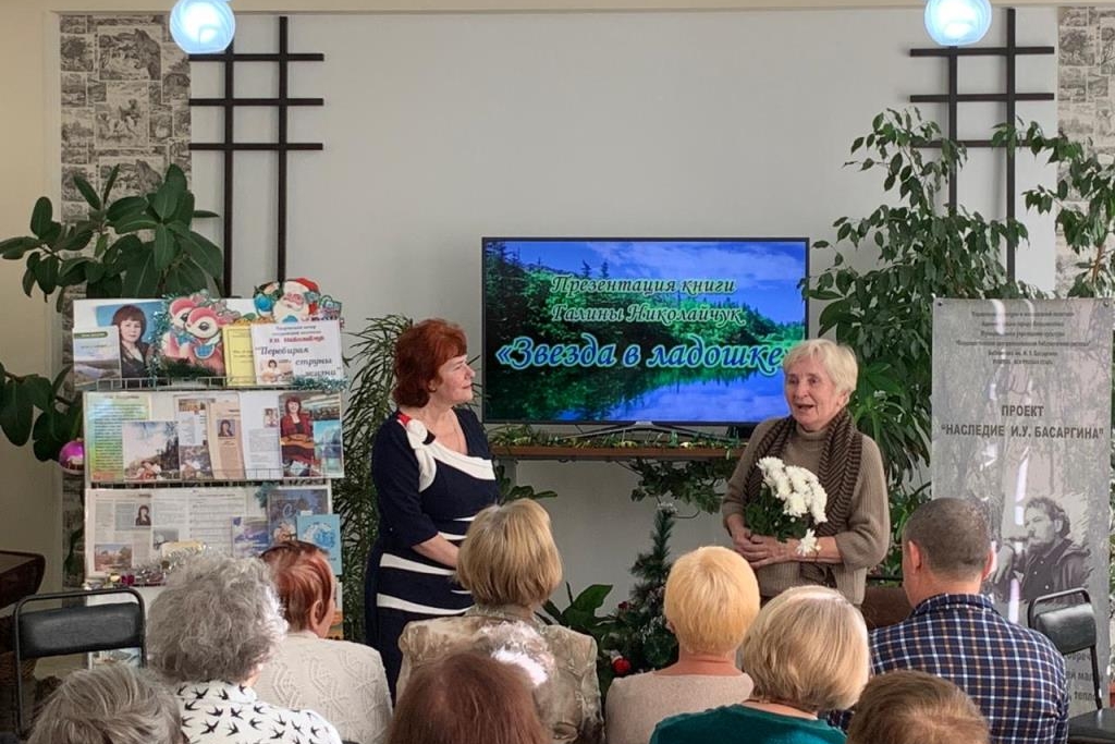 В воскресенье в уютном, переполненном до отказа, читальном зале библиотеки им. И.У. Басаргина состоялась творческая встреча с приморской поэтессой, автором-исполнителем песен и романсов, фотографом Галиной Николайчук. Она представила читателям библиотеки очередную (пятую) книжку стихов и прозы « Звезда в ладошке», которая вышла в канун 81- й годовщины образования Приморья. В сборник вошли избранные стихи и трёхстишия из предыдущих сборников автора «Серебряные росы», «Тихой улицы свет», «Час до встречи», «Купола над Уссурийском», новые стихи, а также рассказы, написанные в 2012-2019 гг.