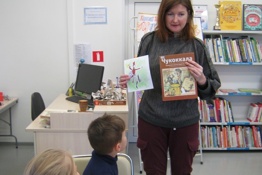 5 декабря в суровый утренний мороз две группы детсадовцев МБДОУ №80 посетили библиотеку №8. Вслух читали «Муху-Цокотуху» Корнея Чуковского, и можно было жужжать, зудеть, как комар, топотать, как сороконожки, шуршать газетой, как тараканы, пронзительно кричать, звенеть мелочью в копилке. Правда, шуметь не всем сразу и не когда в голову взбредет, а в строго отведенных местах в тексте про Муху-Цокотуху. Нашумевшись и натопавшись, детвора раскрашивала комара из иллюстраций к стихотворению художника Калиновского, между прочим, этот комар подозрительным образом очень похож на шарж на Чуковского Юрия Анненкова на обложке альманаха «Чукоккала». Дети тоже сразу признали это сходство.