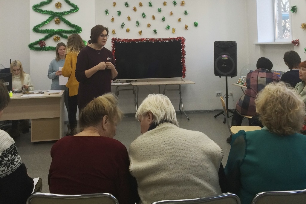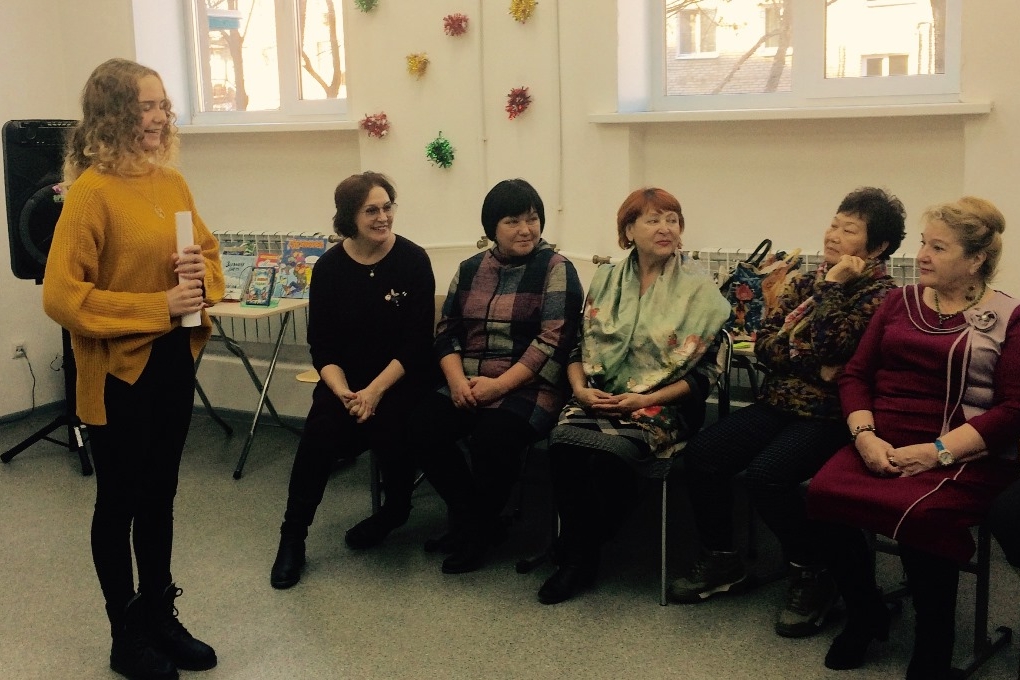 6 декабря в библиотеке №2 (п. Трудовое) для старшего поколения читателей прошел тренинг «Возраст возможностей», его провели преподаватель кафедры дизайна и технологии ВГУЭС Метляева Татьяна Викторовна и студенты социокультурного сервиса Прусова Надежда, Самотюхина София, Феленко Виктория, Воротеляк Пелагея.