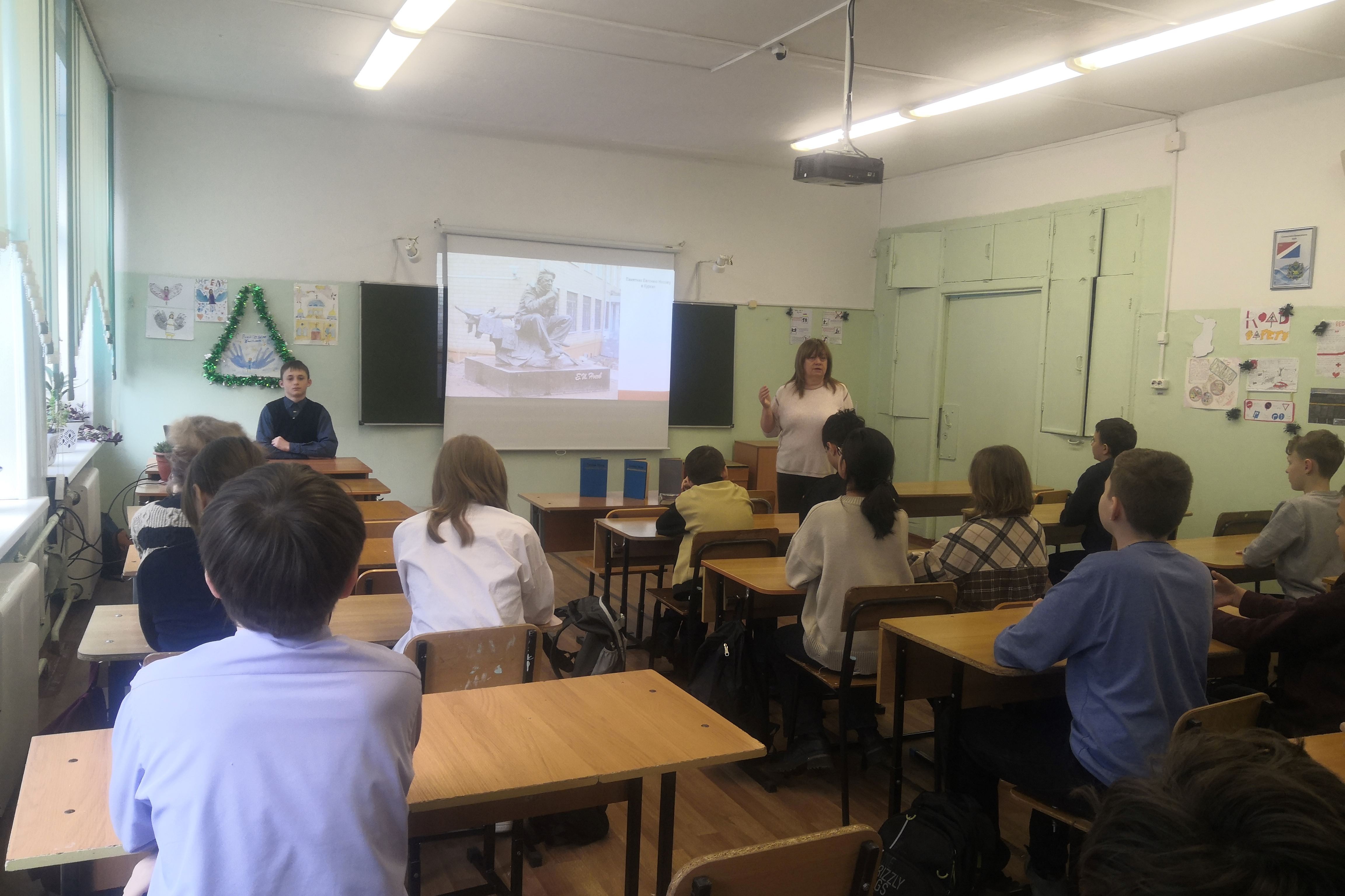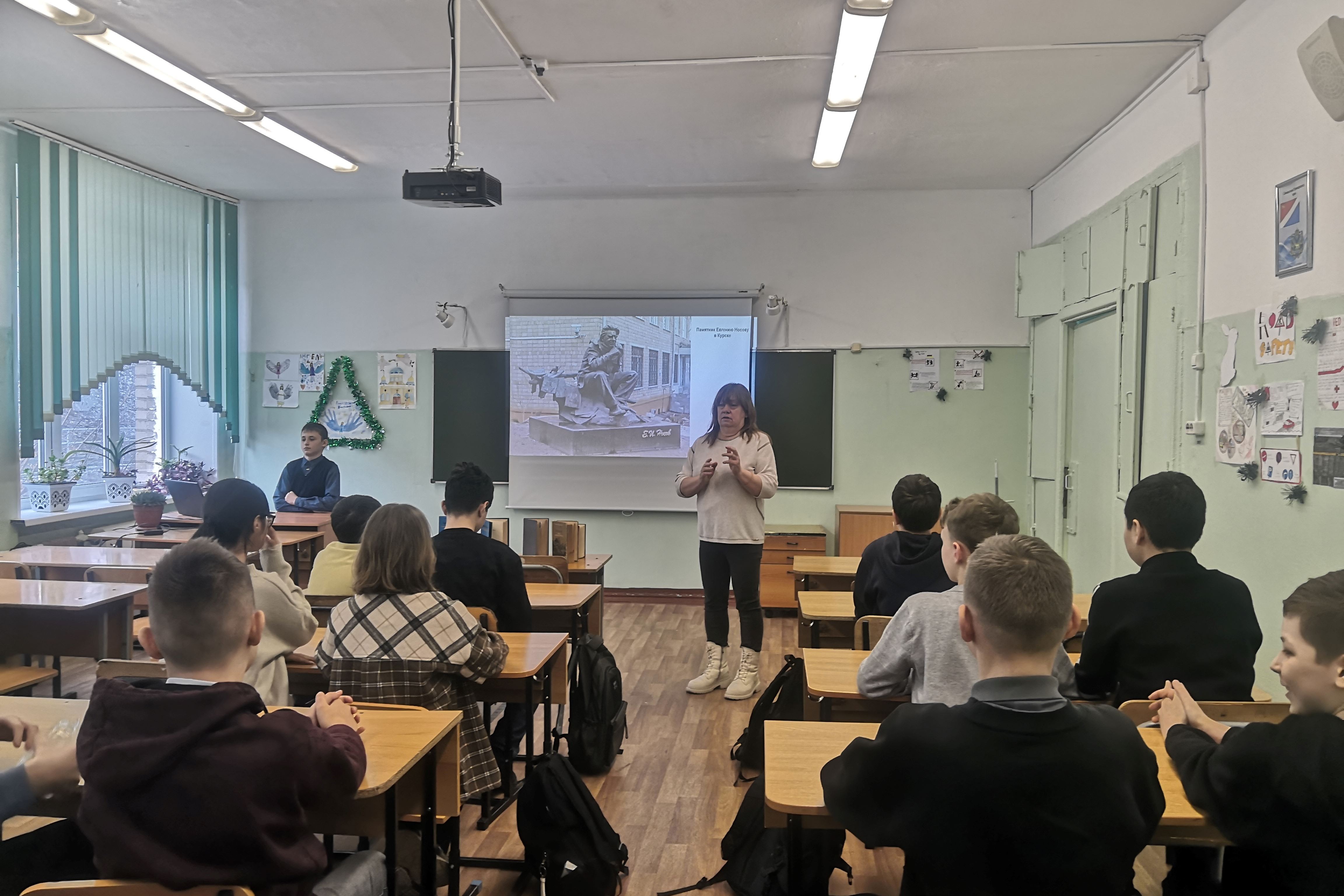 15 января — 100 лет со дня рождения российского писателя, участника Великой Отечественной войны Евгения Ивановича Носова. Библиотека № 16 организовала для учащихся 7 «А» класса СОШ № 43 литературный час «Не погаснуть живому огню», посвященный военной прозе Евгения Носова.