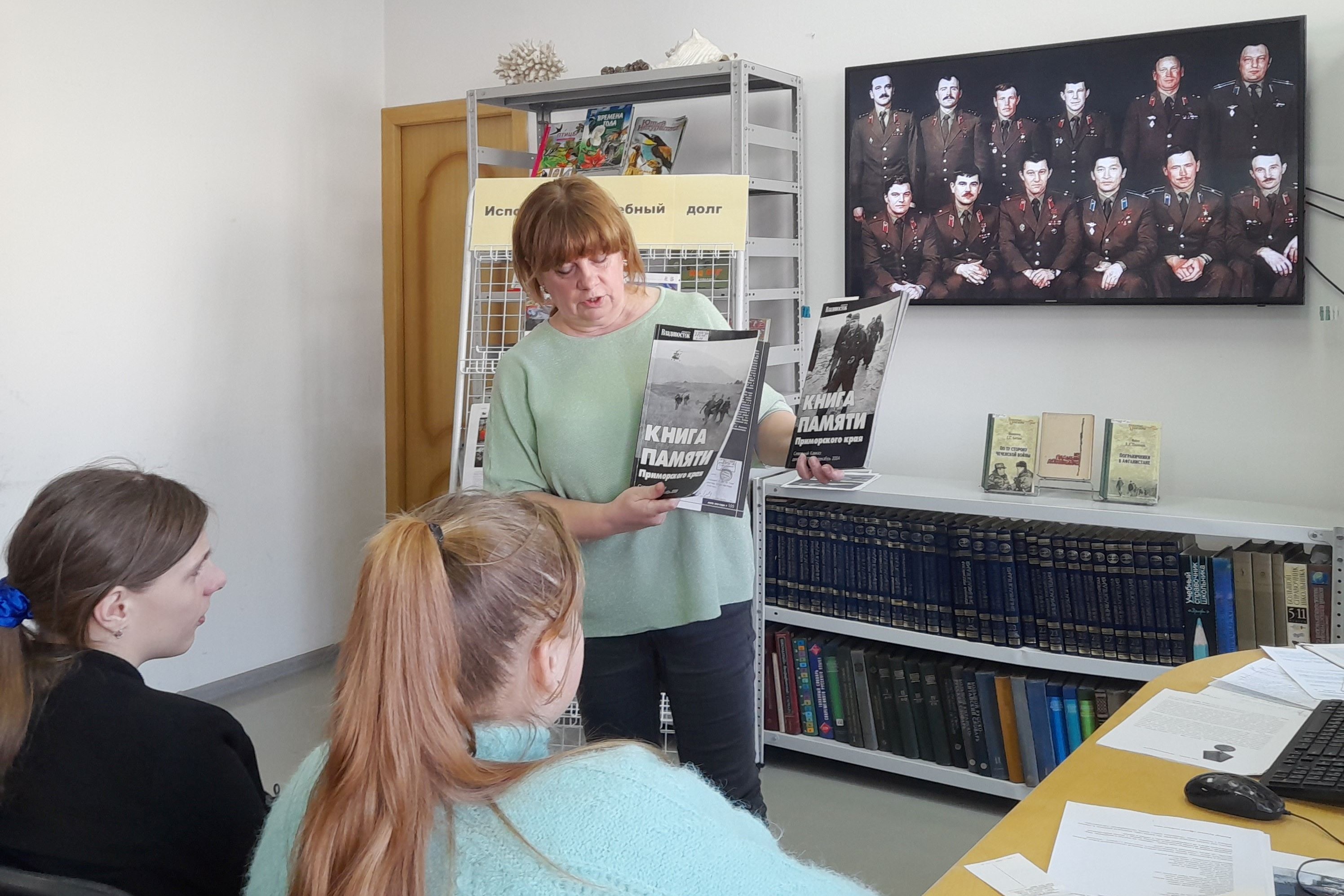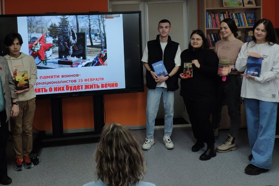 13 февраля сотрудники библиотеки № 20 провели мероприятие для студентов Академического колледжа ВВГУ виртуальный блокнот «Память возвращает нас в Афганистан». Учащихся познакомили с выставкой книг «Камрань» (Ю. Крутских), «Арифметика войны» (О. Ермаков), «Салам, бача!» (И. Цуприков), «9 рота» (Ю. Коротков), показали презентацию о воинах-интернационалистах, исполнявших свой служебный долг в Испании, на Кубе, во Вьетнаме, в Афганистане, Сирии.
