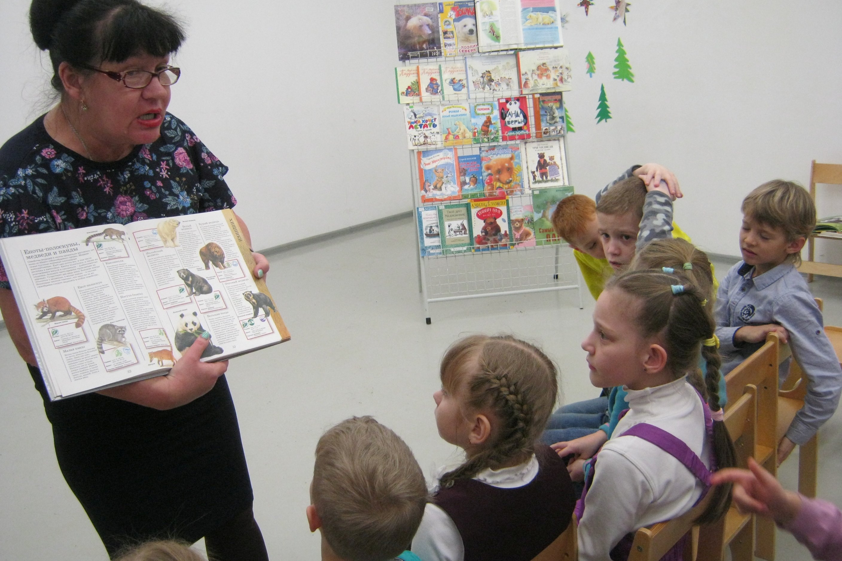 1 марта библиотека № 8 принимала гостей из центра развития творчества детства и юношества. Для детворы из ЦРТДиЮ знакомство с медведями в библиотеке началось с анимации, конечно это был мультфильм «Умка ищет друга». Несмотря на то, что мама Умки в фильме добродушная медведица, в реальности белый медведь – хищник. Все другие представители семейства медвежьих: бурый, очковый, гималайский – хищники, кроме большой панды, эти черно-белые увальни хоть и являются ближайшими родственниками очкового медведя, но едят бамбук. Панда – любимица детей, они и сами готовы рассказать все, что знают об этом обаятельном звере.