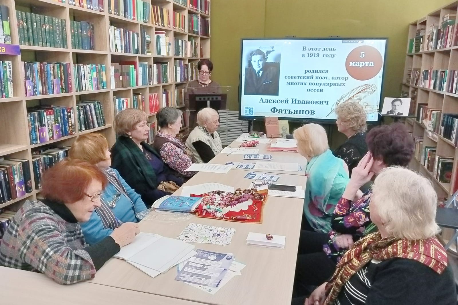 13 марта в библиотеке № 4 для клубного объединения «В мире прекрасного» состоялась литературно-музыкальная гостиная. 5 марта исполнилось 105 лет со дня рождения русского советского поэта, участника Великой Отечественной войны, автора многих популярных в 1940–1970-х годах песен. Песни на слова Фатьянова звучат во многих фильмах, среди которых такие хиты, как «Свадьба с приданым», «Небесный тихоход», «Весна на Заречной улице», «Дом, в котором я живу», «Большая жизнь». Песни Алексея Фатьянова получили всенародное признание. Нельзя представить народную жизнь без вошедших в нее навсегда удивительных стихов этого поэта, ставших песнями.