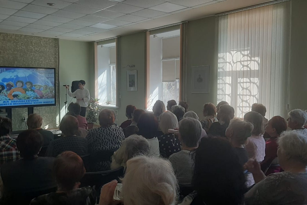 Сотрудники библиотеки подготовили электронную презентацию «Мартовский калейдоскоп», в которой объединили информацию о праздниках, отмечаемых в марте. Отдельные слайды были посвящены знаменитым россиянкам, в том числе, нашим землячкам, а также интересным фактам о Международном женском дне. Заинтересованность у гостей вызвал обзор книг популярных авторов — «Женский почерк» – как новинок книгоиздания, так и давно знакомой классики. Не обошли вниманием и Масленицу, тем более среди гостей были преимущественно женщины и каждая — мастерица печь блины.