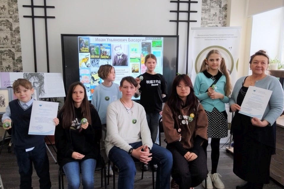 12 апреля в библиотеке им. И.У. Басаргина состоялась творческая встреча с учащимися детских объединений «Школа юного филолога» и «Литературное краеведение» (руководитель Людмила Леонидовна Мирошниченко) Владивостокского Дворца детского творчества, на которой школьники познакомились со страницами судьбы и творчества писателя, имя которого носит библиотека, с его книгами для детей и подростков, с недавно изданной библиотекой книгой «Веточка тиса», включающей не только рассказ И.У. Басаргина, но и занимательные задания, разработанные учителями русского языка, литературы и биологии, посмотрели красочную презентацию.