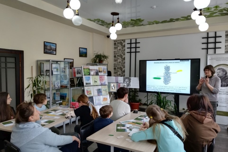 В ходе беседы выявили, какие правила безопасного поведения в природе весной нарушил герой рассказа, оказавшийся жарким майским днем на берегу таежной речки. Рассмотрели изображения встретившихся герою обитателей: зимородка, горной трясогузки, куличка, кукушки, желны (чёрного дятла), ежа, амурского полоза и отметили их особенности. Ребята узнали много интересного о занесённом в Красную книгу РФ, Приморского, Хабаровского края и Сахалинской области реликте Дальнего Востока – тисе остроконечном, обратили внимание на то, что хвоя, кора, семена этого дерева ядовиты, а затем раскрасили контурное изображение маленькой веточки тиса, которое осталось ребятам на память о встрече. Кроме того, ребята оформили листы, на которых разместили портрет, даты жизни И.У. Басаргина, фотографии обложек его книг для детей и подростков, отзывы о его произведениях.