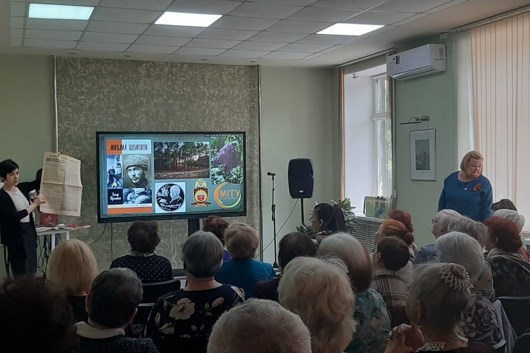 Патриотический час «Военкор Михаил Шолохов», посвященный 120-летию со дня рождения писателя состоялся 13 мая в библиотеке им. Н.Н. Муравьева-Амурского (ул. Калинина, 21). Гости встречи – участники Союза Пенсионеров Первомайского района познакомились со страницами биографии и творчества Михаила Шолохова, связанными с периодом Великой Отечественной войны. Писатель встретил известие о начале войны в родной станице и обратился с речью к землякам, а также подал заявление на зачисление в действующую армию, а также перечислил премию, присужденную ему за роман «Тихий Дон», в фонд обороны, а позже приобрел 4 установки «Катюши» для нужд фронта. Читатели старшего возраста узнали о фронтовых дорогах Шолохова от Сталинграда до Кенигсберга, прослушали отрывки из писем бойцов, которые собирал писатель, познакомились с историей создания рассказов «Наука ненависти», «Судьба человека» и отдельных глав романа «Они сражались за Родину», сравнили их с известными экранизациями. Участники встречи прослушали отрывки из фронтовых заметок и рассказа «Наука ненависти», а также познакомились с памятниками писателю и его мемориальным музеем.