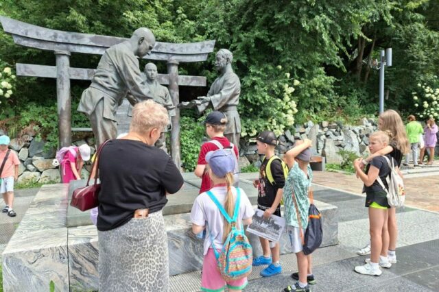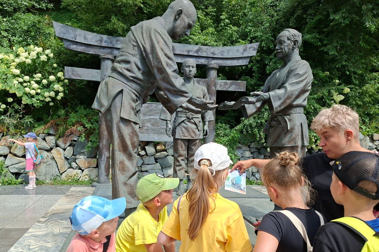 Далее участники познакомились с историей первого памятника Владивостока – адмиралу Г.И. Невельскому. Рассматривая старые фотографии, дети смогли сравнить, как изменился облик памятника и окружающей его городской среды за прошедшие 100 лет. В тенистом сквере Невельского ребята с интересом слушали о других памятниках улицы Светланской, так или иначе связанных с героическими событиями прошлого столетия. Перед муралом «Моряки-тихоокеанцы» экскурсия продолжилась рассказом о героях Советско-японской войны. Дети узнали о самоотверженности санинструктора Марии Цукановой, погибшей при спасении раненых, о подвиге Николая Вилкова и Петра Ильичева, закрывших своими телами амбразуры вражеских дотов, а также о других героях – Михаиле Крыгине и его боевых товарищах, о героях Хасана. Для закрепления материала, в сквере мемориального комплекса, посвящённого основателю дзюдо в России Василию Ощепкову, библиотекари провели интерактив, где юные экскурсанты разбирали фотографии памятников по видам, а также искали отличия, сравнивая современный вид памятников с их историческими изображениями.