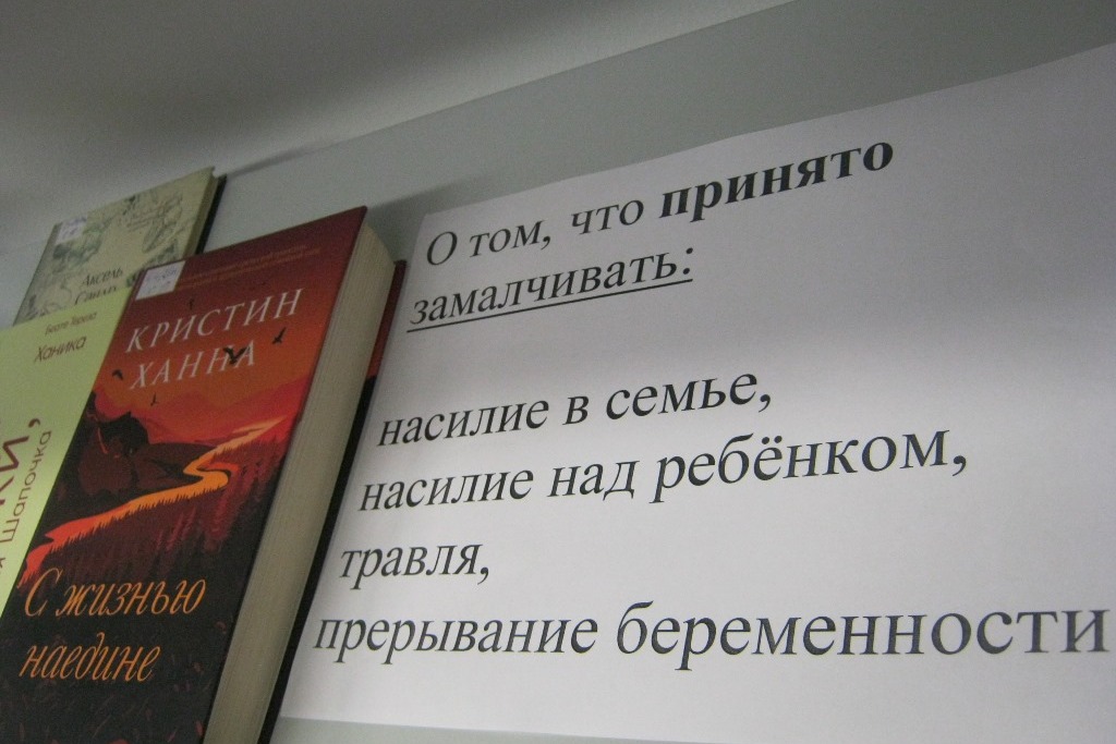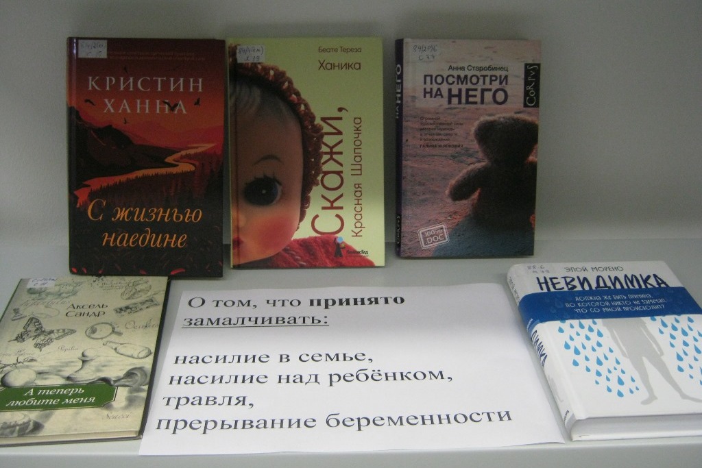 В библиотеке №8 на отдельной полке вниманию читателя представлены книги, объединенные одной темой: «О том, что принято замалчивать». Семейная история, где с молчаливого согласия родных происходит насилие над ребенком, травля подростка в школе, неспособность женщины отличать плохое от хорошего при постоянных оскорблениях и побоях мужчины, тяжелые чувства беременной женщины, которая приняла печальное решение по результатам медицинских показаний.