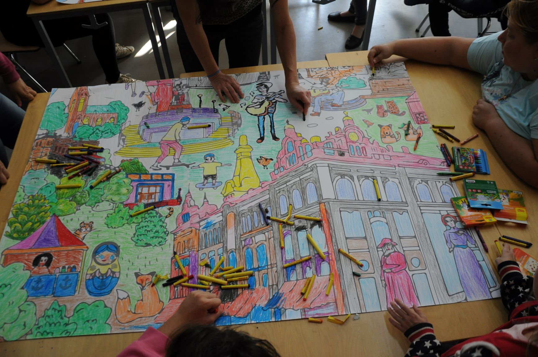 Над работой царила творческая суета, ребята переходили от одного участка к другому, подбирая самые удачные, на свой взгляд, цвета. Мероприятие явно реализовало свою инклюзивную задачу, и все дети общались и рисовали, не обращая внимания на особенности друг друга.
