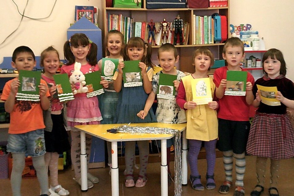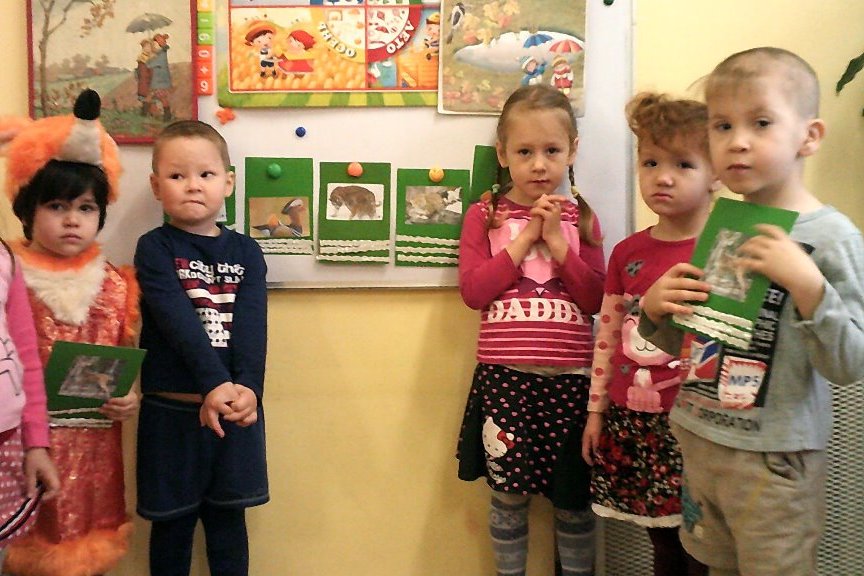 На этот раз с помощью кукол была показана детям сказка Н. Грибачева «Заяц Коська и родничок». История дружбы любопытного зайчика и родничка в веселой игровой форме рассказывает о круговороте воды в природе. Ребята с удовольствием изображали капельку-путешественницу и лисичку, пришедшую к роднику попить воды. У детей на иллюстрациях к этой сказке, сделанных в жанре аппликации, по хрустальной воде ручейка плавала красавица утка-мандаринка. К роднику приходили обитатели дальневосточной тайги, занесенные в Красную книгу: амурский тигр и дальневосточный леопард. Их совсем не боялся олень-цветок, ведь вода жизненно необходима всем и около нее звери не обижают друг друга. В конце занятия дети порассуждали, почему так важно беречь источники воды и природу и сделали вывод, что люди тоже часть этой природы.