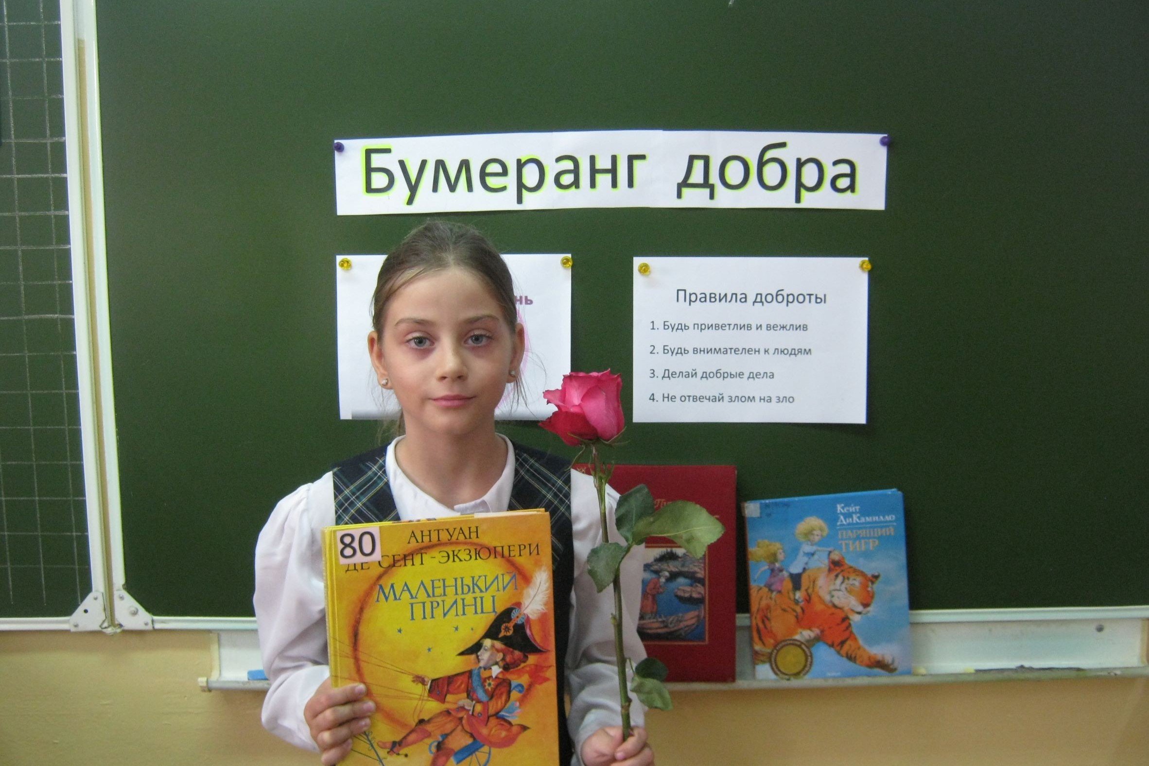 Дети подготовили добрые стихи о доброте душевной и доброте природной. Особенно трогательно пересказала историю о «Маленьком принце», который в этом году отмечает 80 –летний юбилей, Настя Волина. Затаив дыхание, слушали одноклассники историю «Маленького принца», и о его крохотной плане, и о капризной розе. Он путешествовал по многим планетам, а попав на Землю нашел новых друзей, которые полюбили мальчика, были добры к нему, а он рвался назад, к своей розе. Мы в ответе за тех, кого приручили. Значит и мы жители планеты в ответе за свою Землю, пусть она большая и розы растут в каждом саду, но без нашей заботы и доброты, и добрых дел, и вежливых слов планета может погибнуть. «Не важно, чем закончилось вчера, есть новый день и добрые дела».
