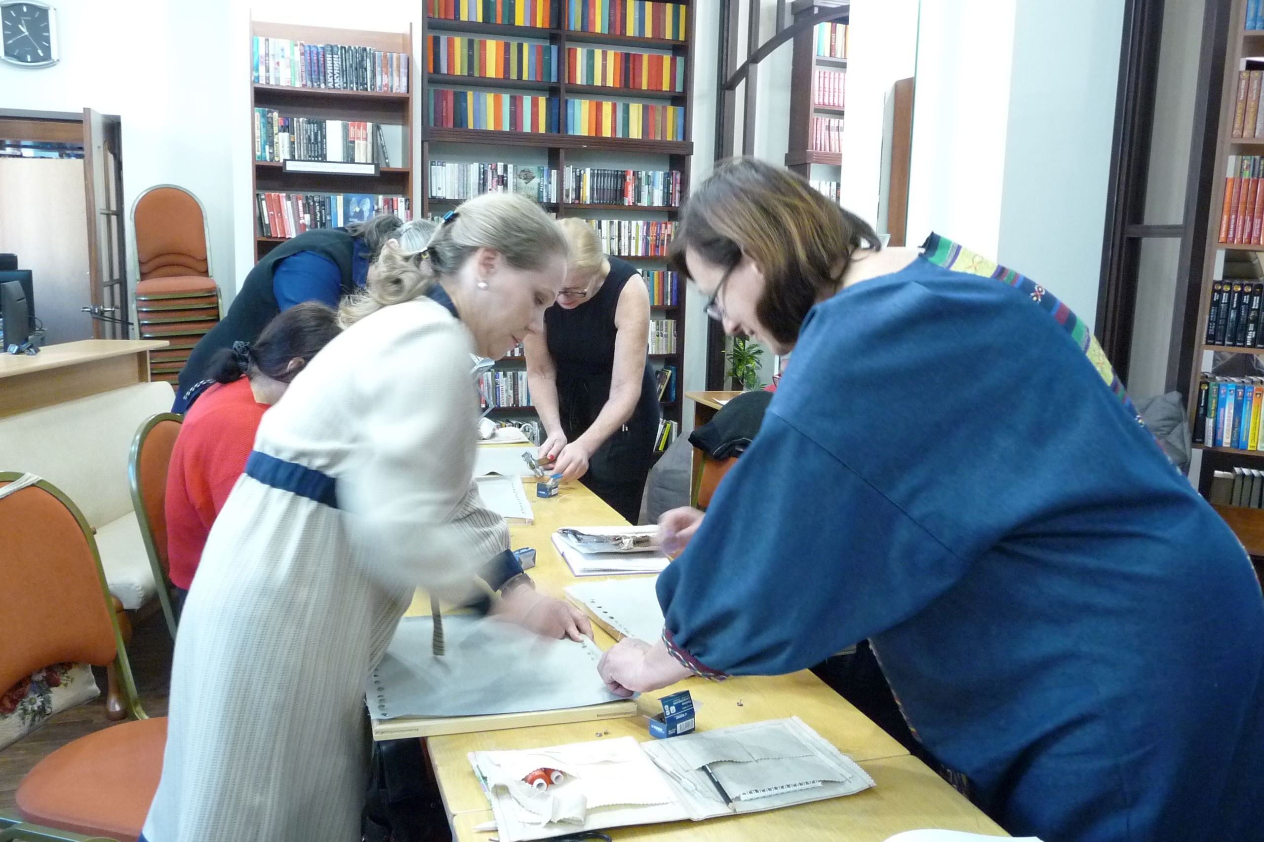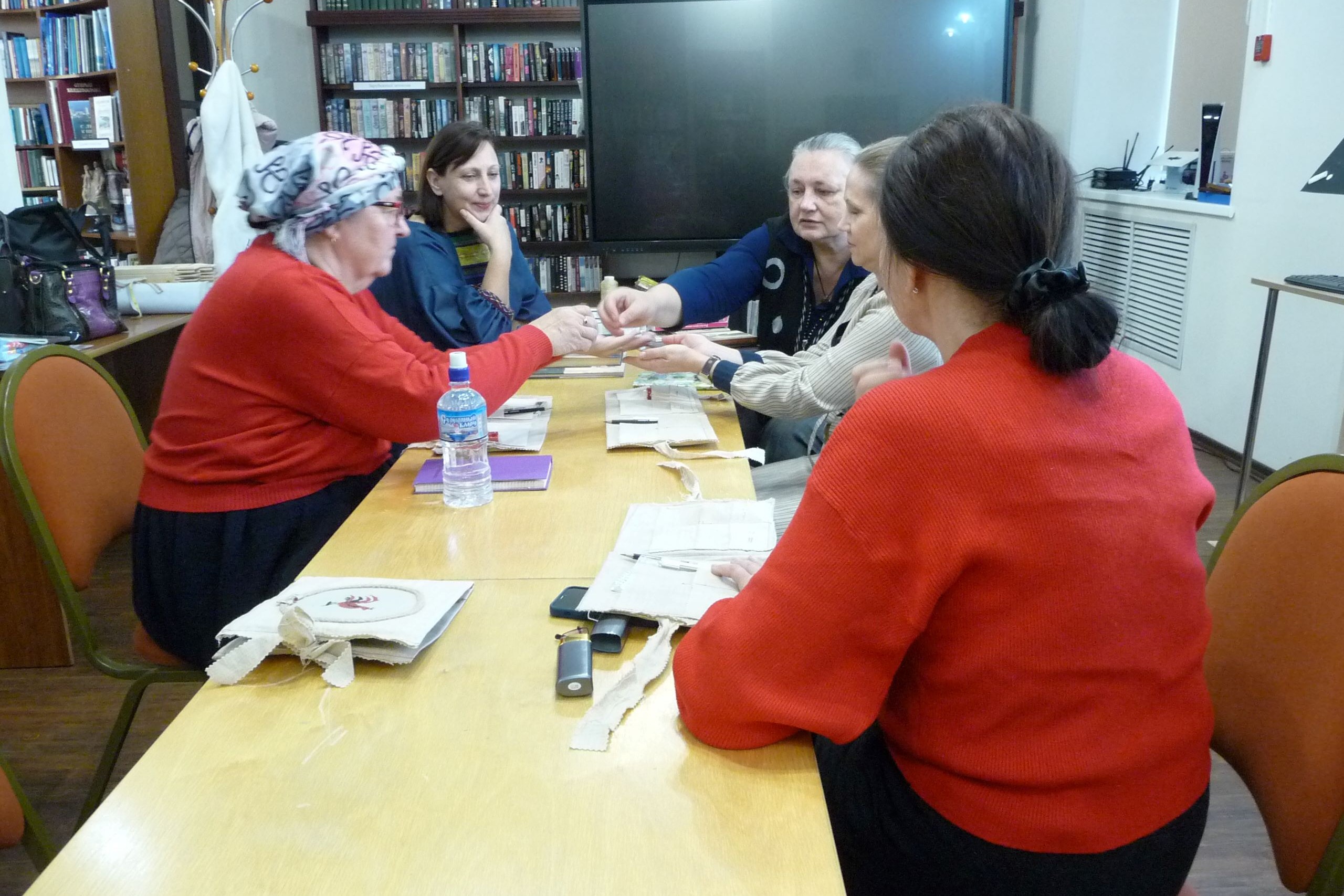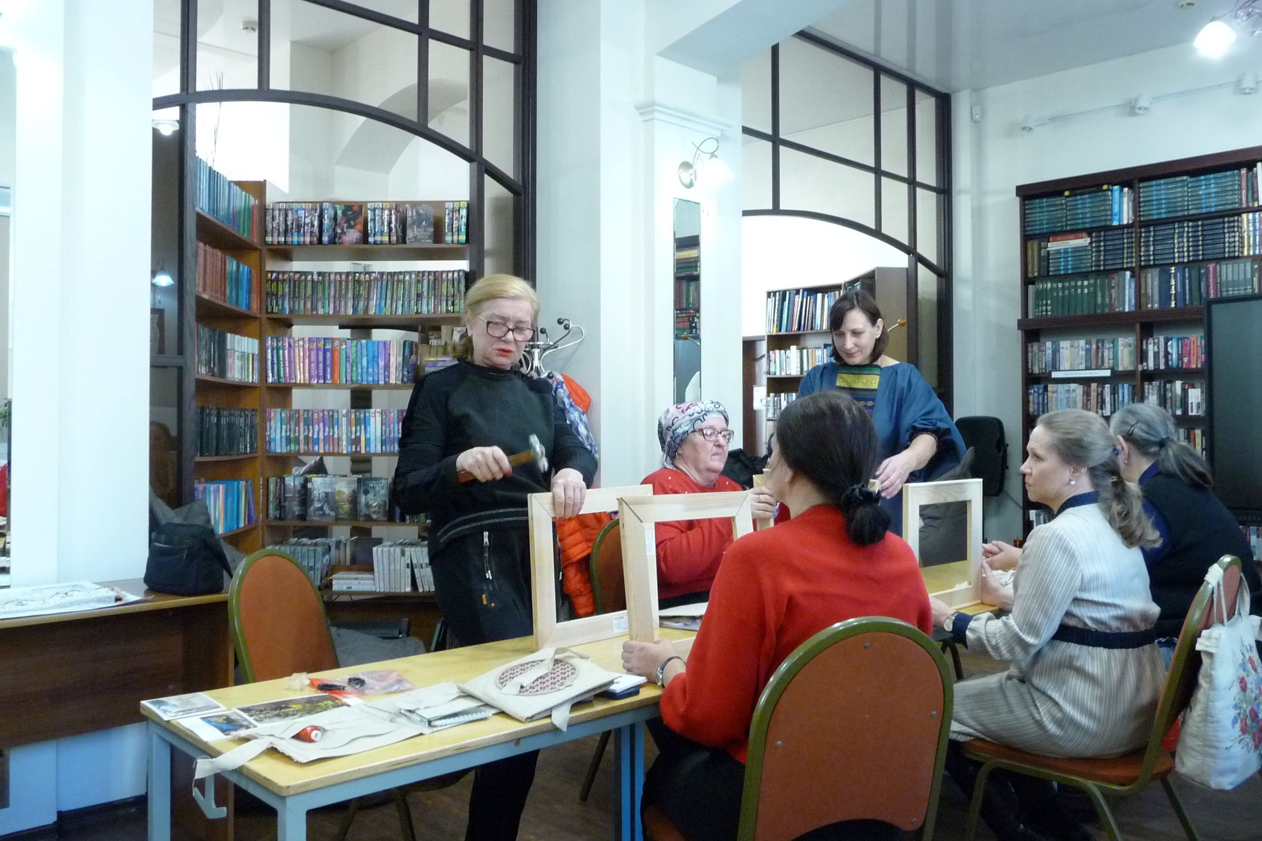 11 ноября в библиотеке № 10 прошло первое занятие пробного курса прототипирования изделий в техниках золотного шитья. Организаторы курса Жанна Владимировна Славинская и Ольга Владимировна Иов из мастерской светского и церковного золотного шитья «Золотая нить» познакомили учениц с образцами орнаментов с исторической одежды и театральных костюмов 19– 20 веков из книжных фондов библиотеки, а также порекомендовали каталоги, книги и другие издания.