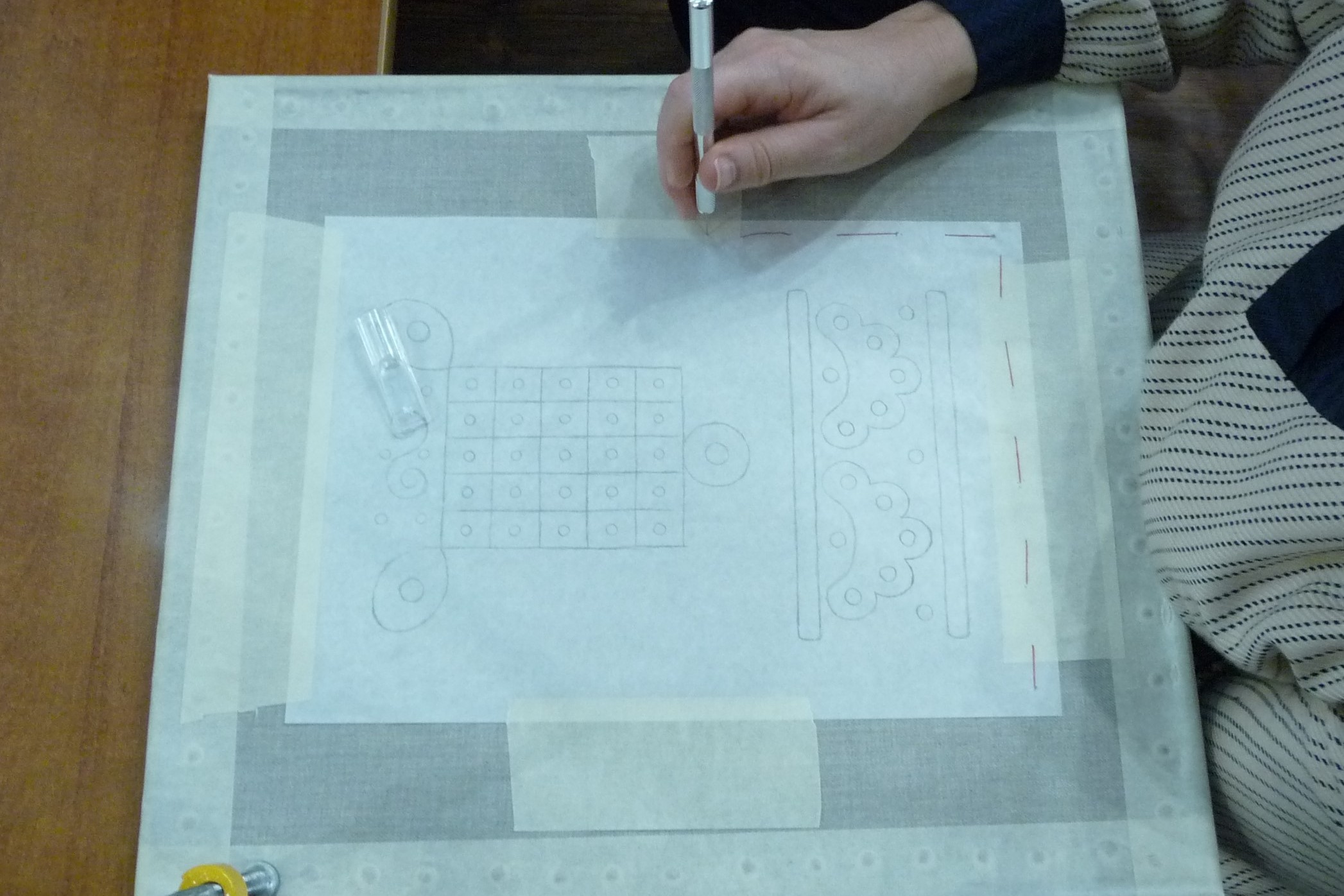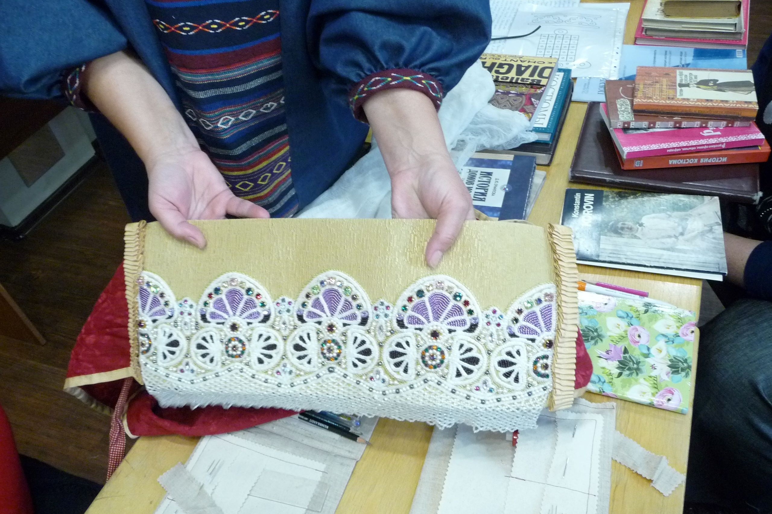Важной составляющей в работе вышивальщиц является изучение исторических артефактов. Насмотренность исторических орнаментов, произведений русского искусства помогает при создании собственных эскизов, которые можно будет привнести в современные изделия. Участникам курса продемонстрировали девичью повязку и изображения других женских головных уборов.