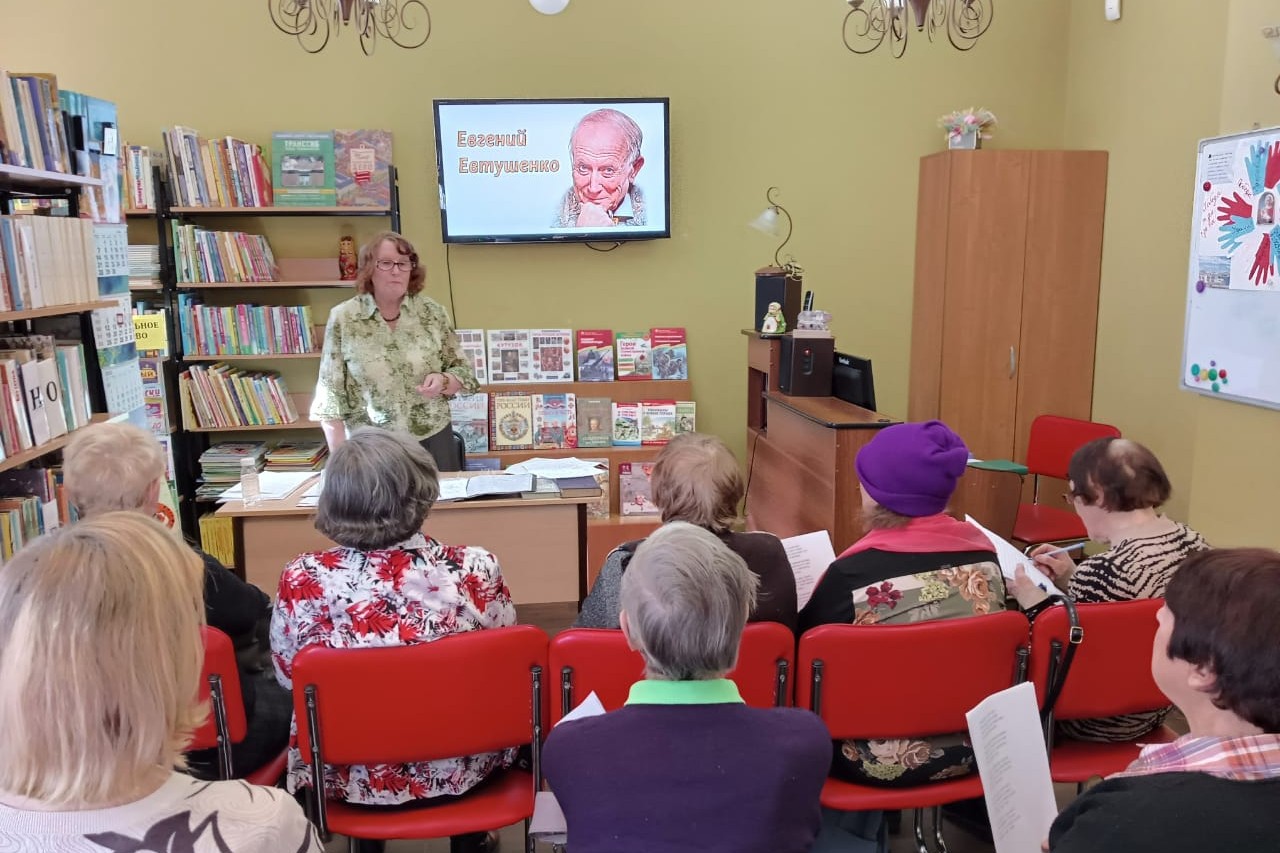 В библиотеке № 4 состоялась интересная творческая встреча, посвящённая знаменитому эстрадному поэту – шестидесятнику Евгению Александровичу Евтушенко (к 90-летию поэта) — литературно-музыкальная гостиная «Ты со мной приключился словно шторм с кораблём». Встречу совместно сотрудниками библиотеки провела слушатель клуба «В мире прекрасного» Савченко Нина Васильевна.