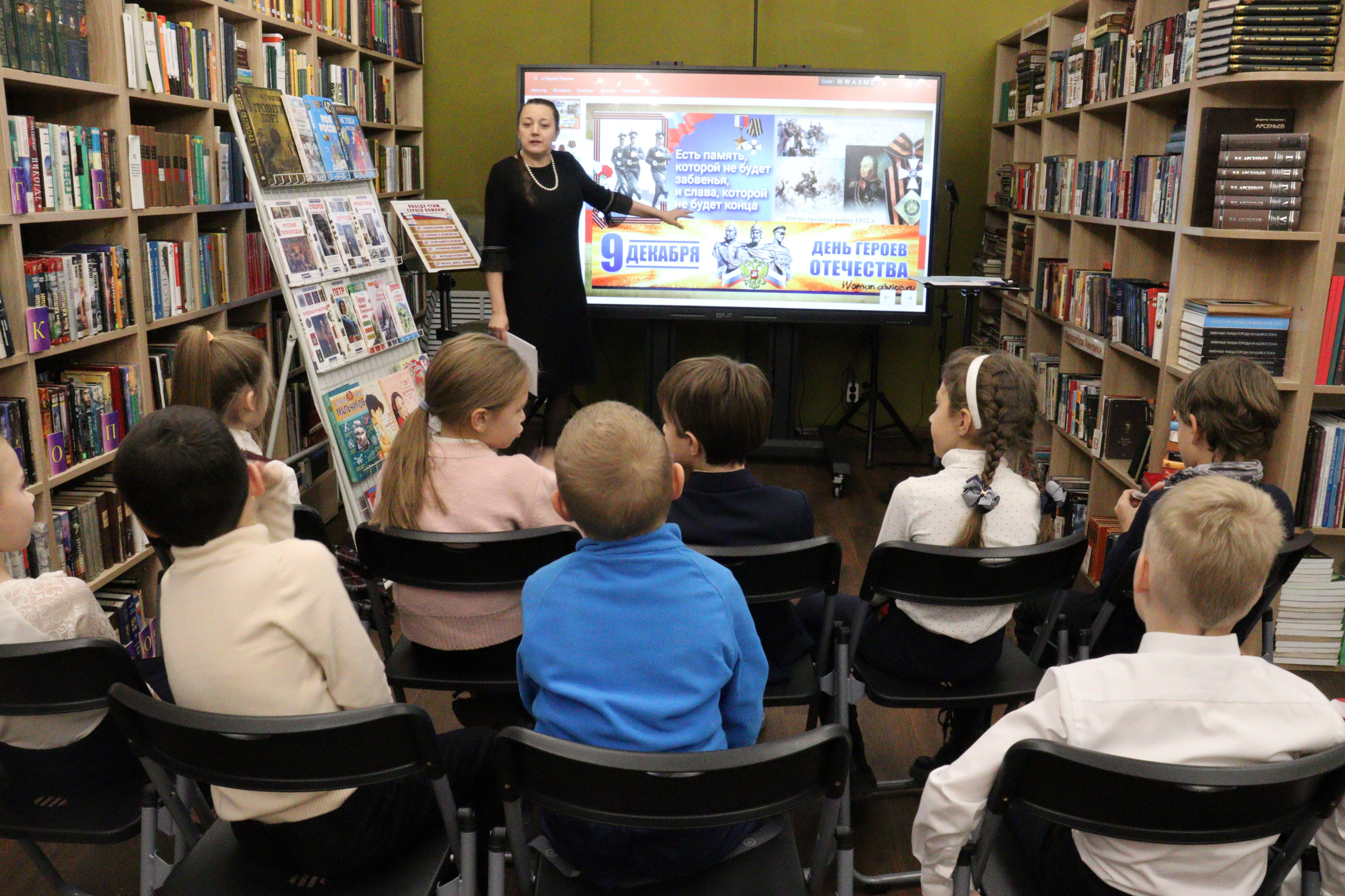 8 декабря, накануне Дня Героев Отечества, библиотека № 4 пригласила ребят из начальных классов принять участие в уроке памяти «Слово во славу Героев». О Героях былых времён и о тех, кто сегодня удостоен звания Героя России, о беспримерном подвиге и мужестве, о том, что значит горячо любить свою стану, — поговорили с юными горожанами.