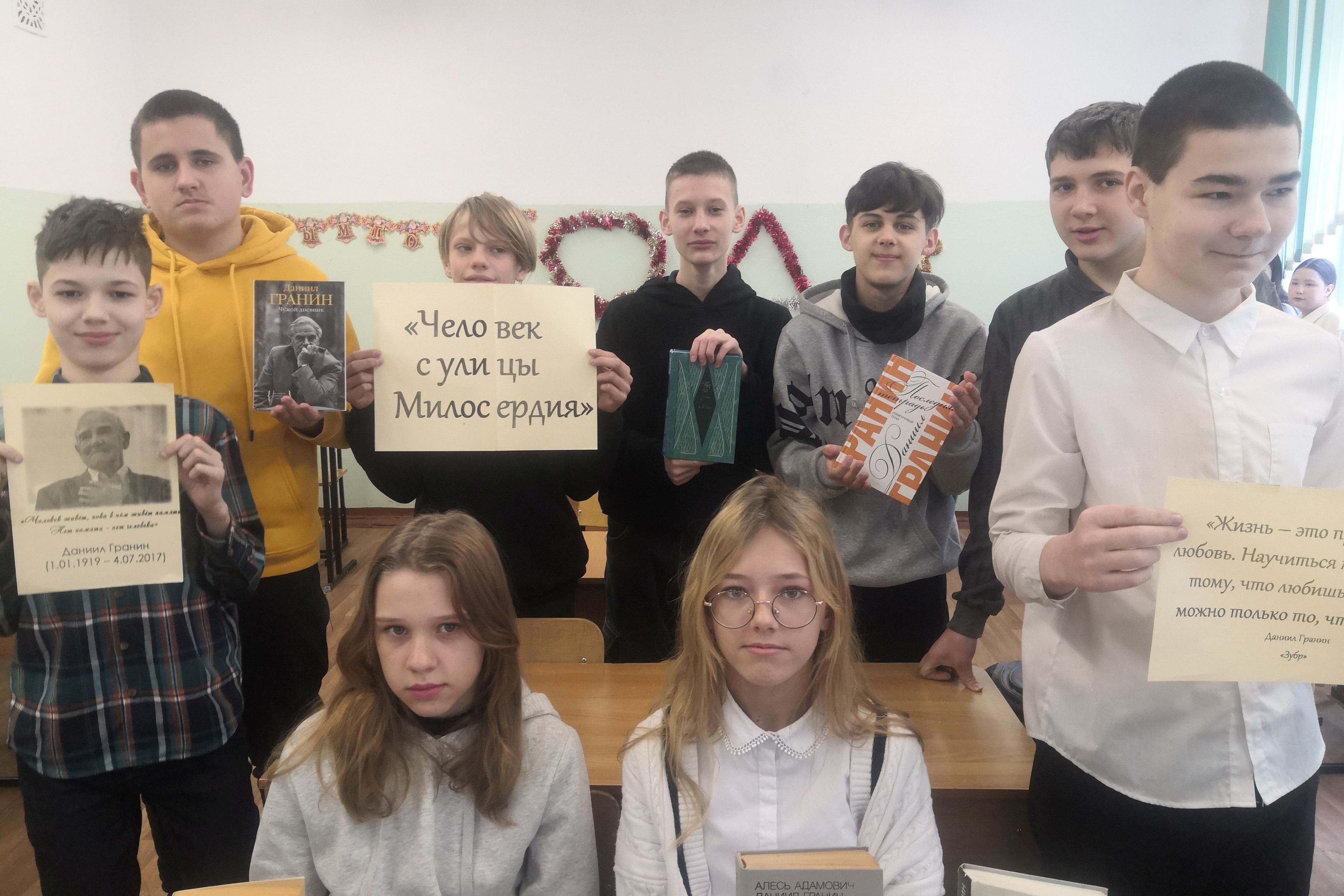 Ребята узнали о том, что писатель прошел войну от начала до конца, получив несколько боевых орденов. «Тяжелая она была, слишком много смерти было вокруг. Существование свое долго еще после войны считал я чудом и доставшуюся послевоенную жизнь бесценным подарком». С ребятами состоялся разговор о том, чем запомнился писатель Даниил Гранин, что оставил он нам?