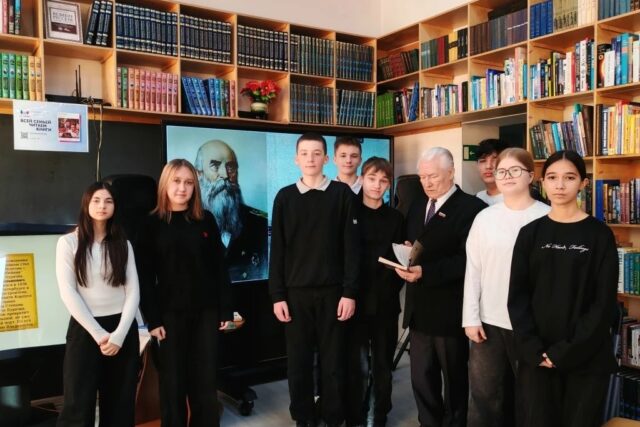 Рассказ сопровождался показом фотографий тех далёких времен. Обратил внимание школьников писатель на книги с выставки, ребята с интересом изучили книги, посмотрели иллюстрации.