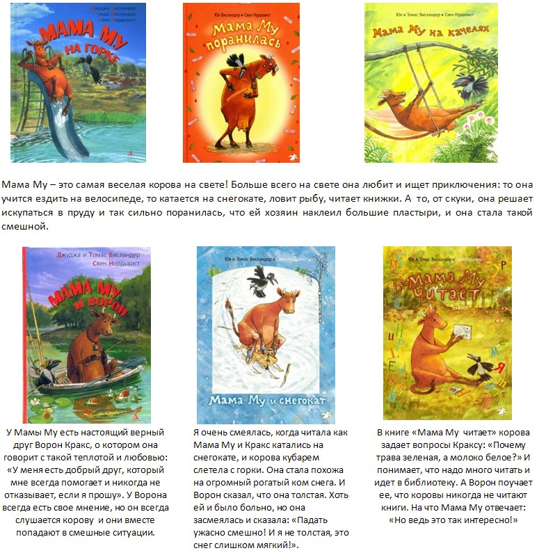 Эти книги очень добрые и душевные! Они учат, как надо дружить, надо все пробовать и ничего не бояться. А какие в книгах красивые картинки! В Маму Му невозможно не влюбиться! Она такая добрая, веселая. Она умеет дружить и радоваться. Я хотела бы, чтобы у меня была такая подруга!