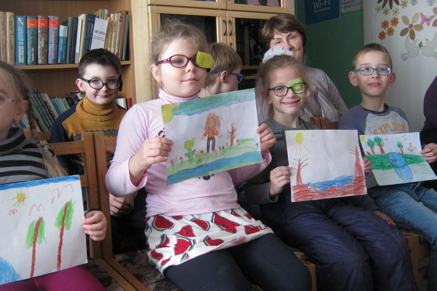 Школьники пришли со своими рисунками, они нарисовали реки Приморского края: зимний Сучан, Большую Уссурку летом, там отдыхала Алена Месяцева со своей семьей. Алена нарисовала яркую картину: голубое небо, голубая река и красные цветы. Рома Ан придумал рисунок восходящего солнца в розовом зареве утра и семейку карпов, плывущих по чистой, прозрачной реке. Все рисунки ребят о голубых реках и зеленых лугах.