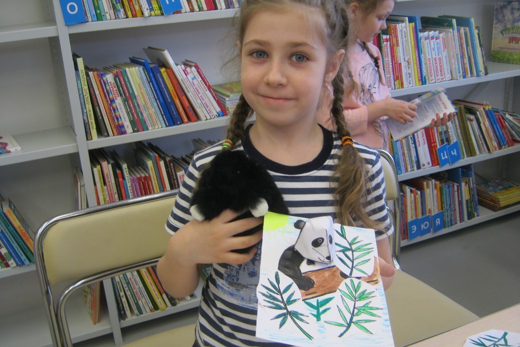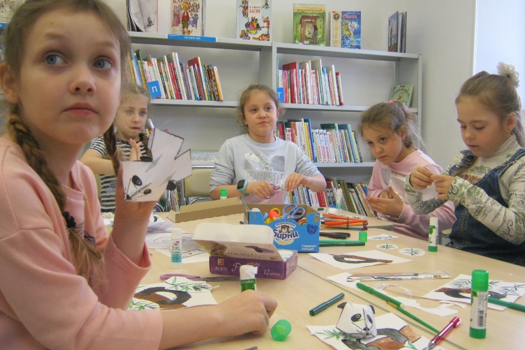 Продолжает свою работу творческая мастерская в библиотеке №8. Поскольку, поделки на творческой, в основном, представляют собой объемные конструкции из бумаги в виде животных, то детвора попросила на одном из занятий апреля сделать панду. Сказано – сделано! Панду пришлось немного адаптировать для младшего школьного возраста, сделать поделку проще. Но дети остались довольны, даже во время занятия распевали песни.