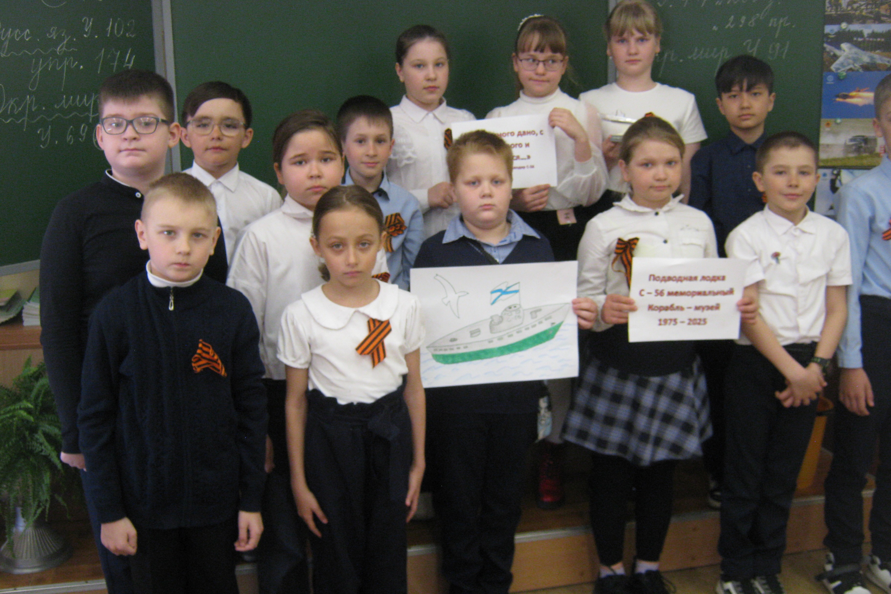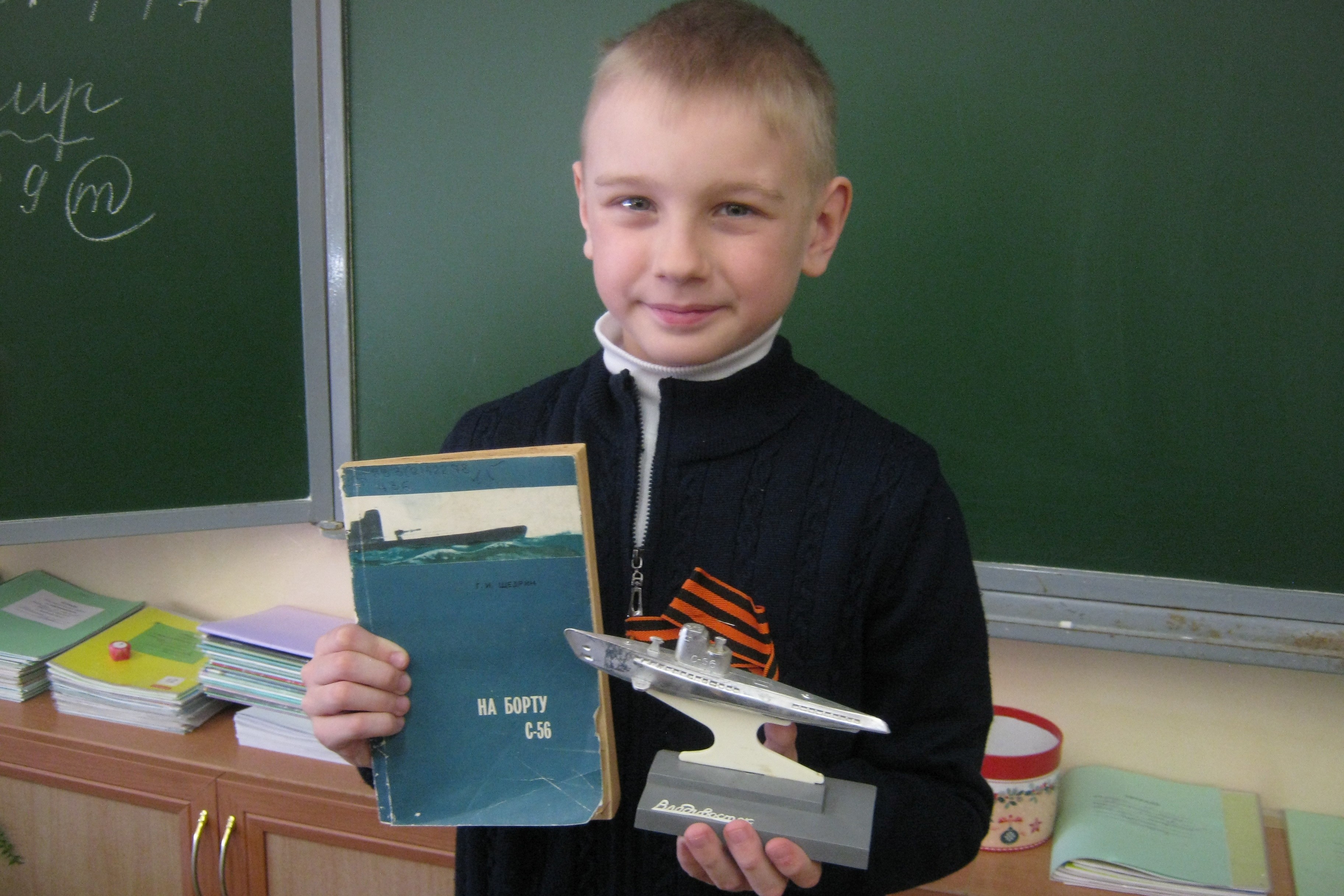 Лодка С-56 была единственная в СССР и в современной России, которая имеет звание Краснознаменная, гвардейская подводная лодка. Андрей, один из учащихся, к мероприятию нарисовал лодку, на которой служит его отец. Андрей дополнил рисунок рассказом о том, какие теперь большие и просторные подводные лодки, они настоящие стражи морских ворот России.
