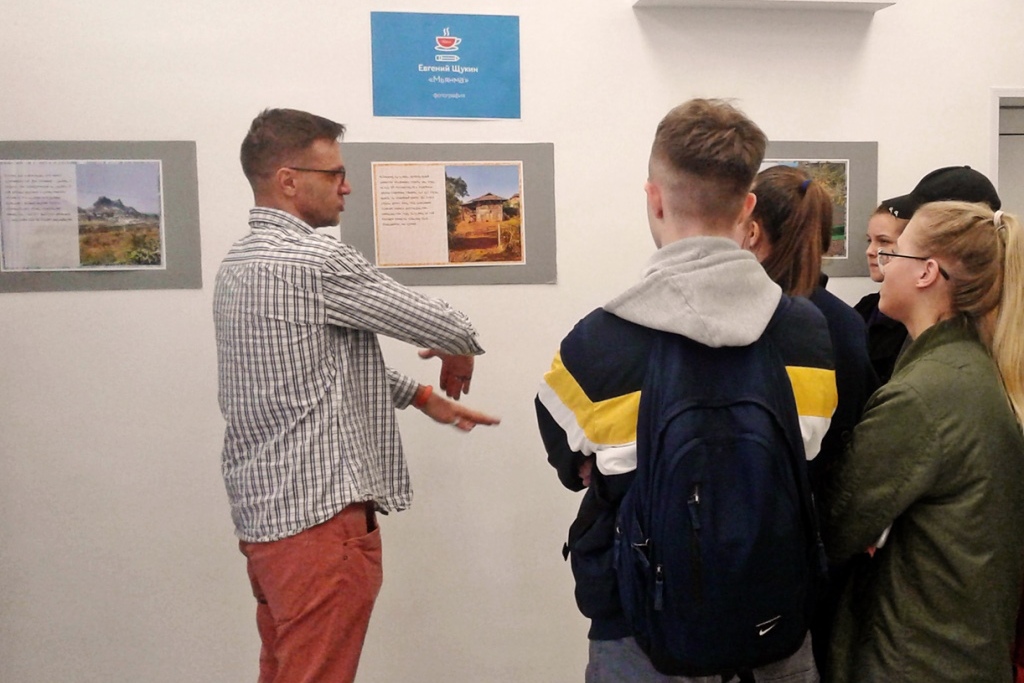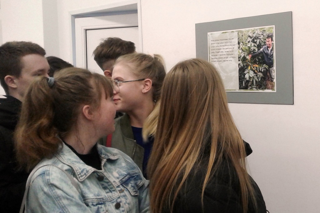 14 мая прошла встреча десятиклассников школы №35 и автора фотовыставки. Евгений Щукин накопил за время работы в кофейной сфере богатый багаж практических и теоретических знаний, и поделился своими знаниями с молодежью. А после провел школьникам экскурсию по своей выставке и признался в симпатии к Мьянме. На этой встрече старшеклассники узнали также о том, кто такой q-грейдер и какие возможности карьерного роста у профессии бариста.