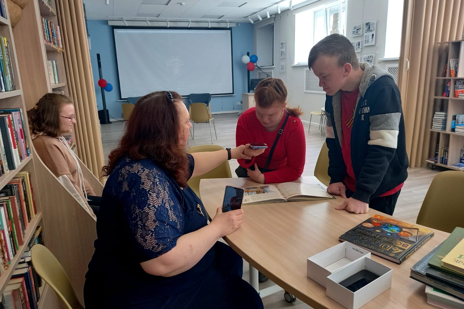 Для ребят был организован просмотр короткометражного мультфильма про волшебные летающие книги, предоставлен экран Smart TV, на котором можно было порисовать.