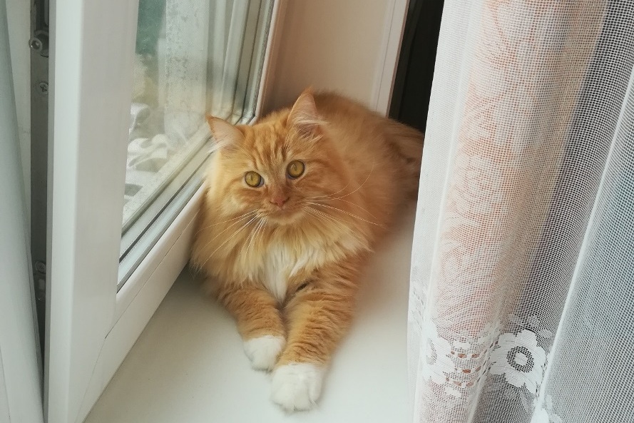 А теперь он вырос и превратился в большого красивого кота. Мы с ним играем в догонялки, а еще наш рыжик любит играть с мячиком, я ему кидаю, а он лапами его ловит. Филимон часто сидит на лоджии и наблюдает за тем, что происходит на улице.