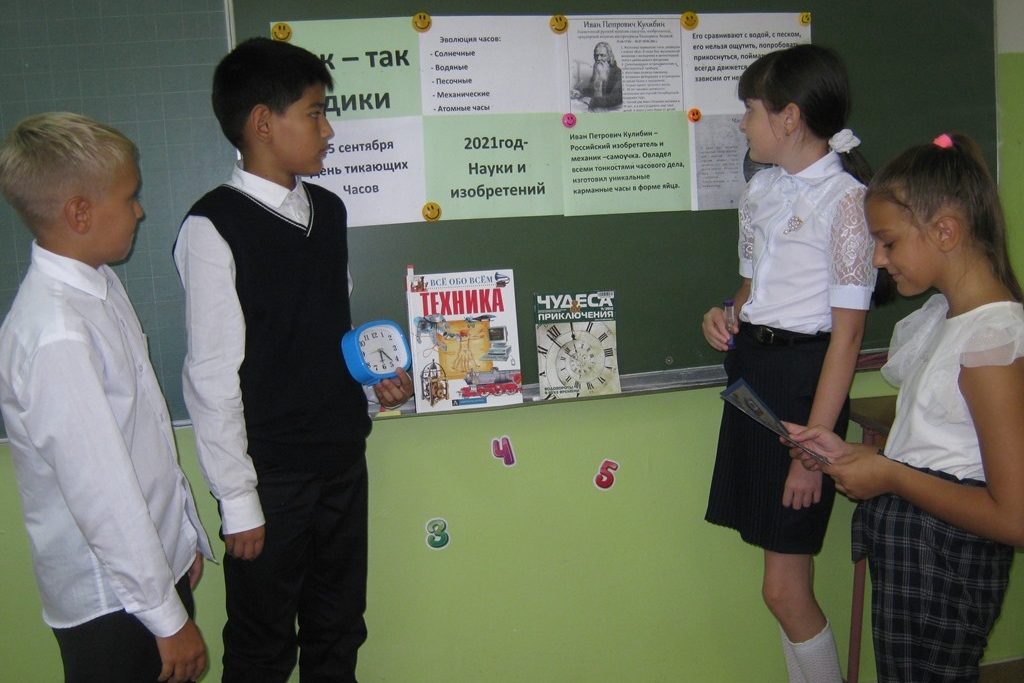 9 сентября библиотека № 15 организовала познавательный час «Тик-так ходики» для учащихся 4 «Б» класса школы № 54. Школьники с интересом слушали историю о часах. Самые древние часы – солнечные – стержень отбрасывает тень на каменный круг, и можно было отслеживать движение времени – часов. Случилось это примерно 1306-1290гг. до н.э. А затем появились водные часы, но и они уступили место песочным часам, кстати, до сих пор песочные часы применяют в некоторых областях науки.